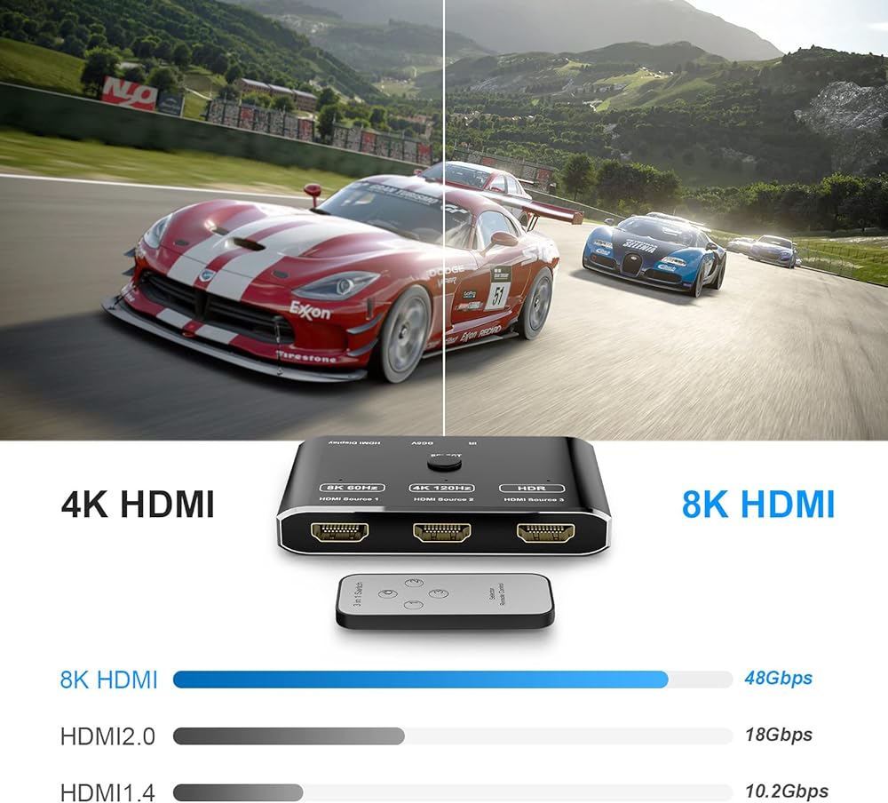 HDMI 2.1 4K@120Hz HDR Switch 3IN1:This HDMI 3IN1 Switch supports most of HDMI 2.1 Features,like eARC,HDR,48Gbps,Dolby Audio etc.It supports 8K@60Hz 4K@120Hz 1080P@240Hz video and picture to output in your HDMI 2.1 supported Monitors.If you would like to have 4K@120Hz HDR video in your Monitors,please make sure your source,display and cables all support 4k@120hz