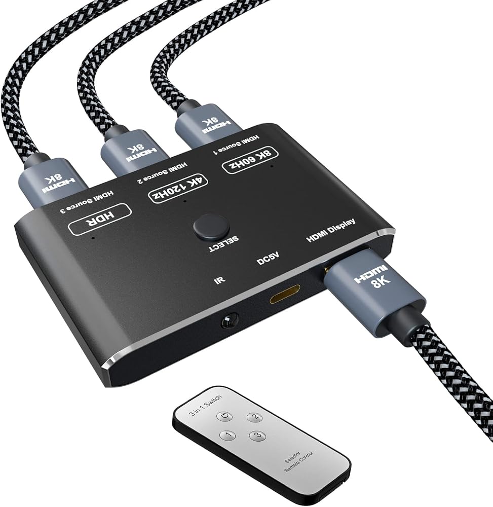 CABLEDECONN 3 Port HDMI 2.1 HDR 3In 1Out 8K Switcher with Remote Control Directional 8K@60Hz 4K@120Hz HDR 48Gbps 3D HDMI Video Converter Compatible with PS5 Xbox x HDMI TVs Monitors