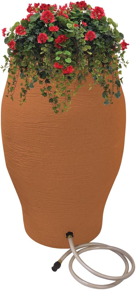 Elevate the look of your lawn or garden with the stoneware Urn rain barrel from emsco group! crafted to combine functionality & style, This deluxe barrel showcases premium construction that's visually stunning! It helps reduce your household's dependency on water from municipal sources so that your energy demand for purifying water for yd & gardening purposes is decreased. save money & help the environment by lowering your water bill with the Emsco Group rescue stoneware Urn rain barrel! This rain Barrel comes with a rain diverter system that includes a 36" Tube, a 48" Main hose, a Barb plug, a ball cock with an on &-off control downspout, & two hose gaskets.