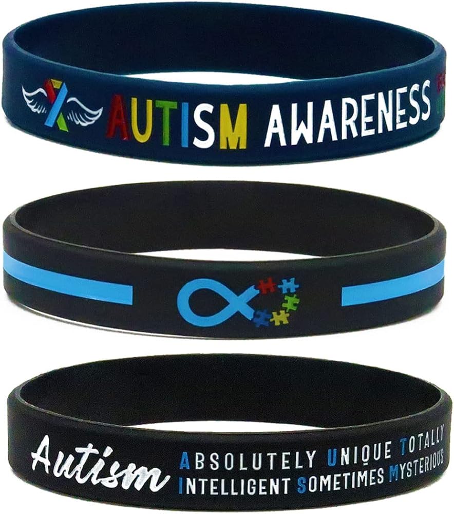 CONTENTS: 6 silicone rubber bracelets / 3 different designs / 2 pieces per design SIZE: 8 inches diameter / One size fits most adult men, women, and tween to teen boys and girls. Pack of 6 Autism wristband favors. Use as goodie bag stuffers or classroom prizes. Soft to the touch and non-invasive to clothing and skin, these versatile bracelets offer an alternative to traditional lapel pins during Autism Awareness month.