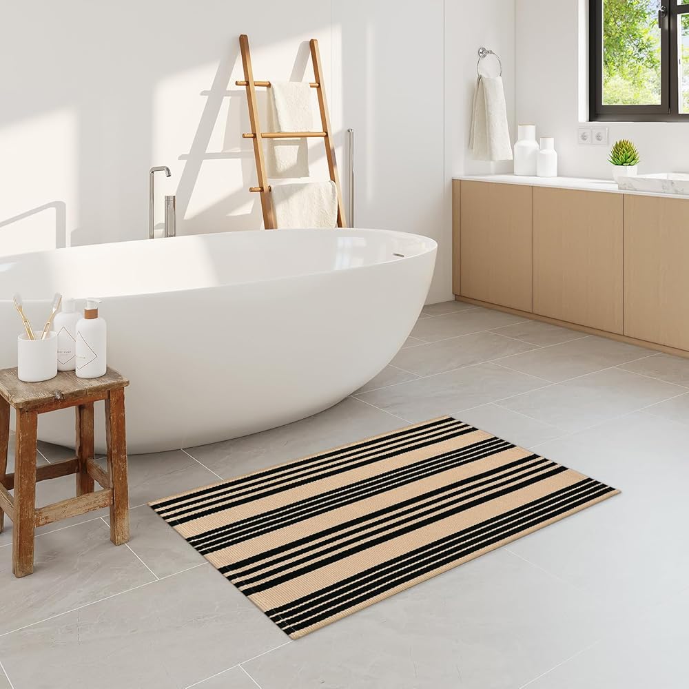 Black and Khaki Striped Outdoor Rug 24"x35", Cotton Hand-Woven Foldable Front Door Mat, Washable Reversible Layered Door Mats for Entryway Porch Decor Home Entrance