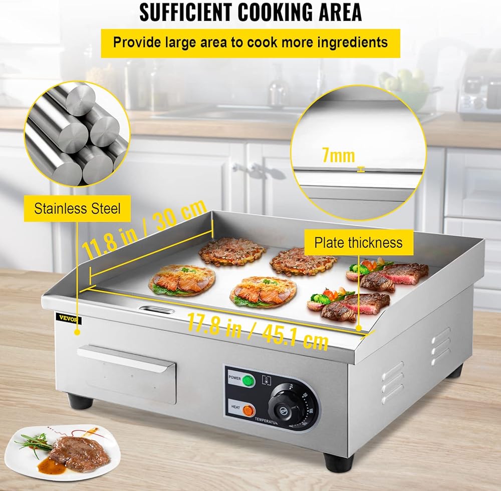 【WIDE APPLICATION】-The electric flat top grill can be used in family or commercial places, such as restaurants, shops, roadside stalls, and snack bars; It is very suitable for processing pancakes, crispy bacon, roast cheese, rich breakfast, fried dishes, omelets, pizza, steak, and hamburgers.NOTE:This product is overpowered and more suitable for commercial use than home use.