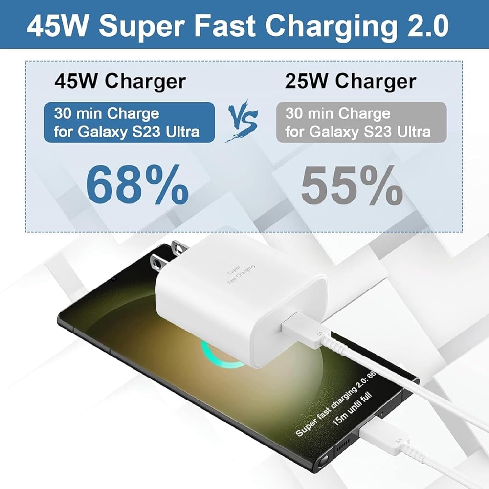 ⚡【45W USB-C Super Fast Charger 】This 45W USB C Charger Adopts Latest PD/PPS Super Fast Charging Technology to Provide Compatible Galaxy Series devices with maximum power of 45W. For example, These Two Mobile Devices Support 45W Power, Charge UP To 50% Within 20 Minutes for Galaxy S24 Ultra/S23 Ultra/(5000mAh), Full Charge Only Takes Less Than 1 Hour,3x Faster Than 15W Old Charger(with 6ft USB-C to USB-C Cable)