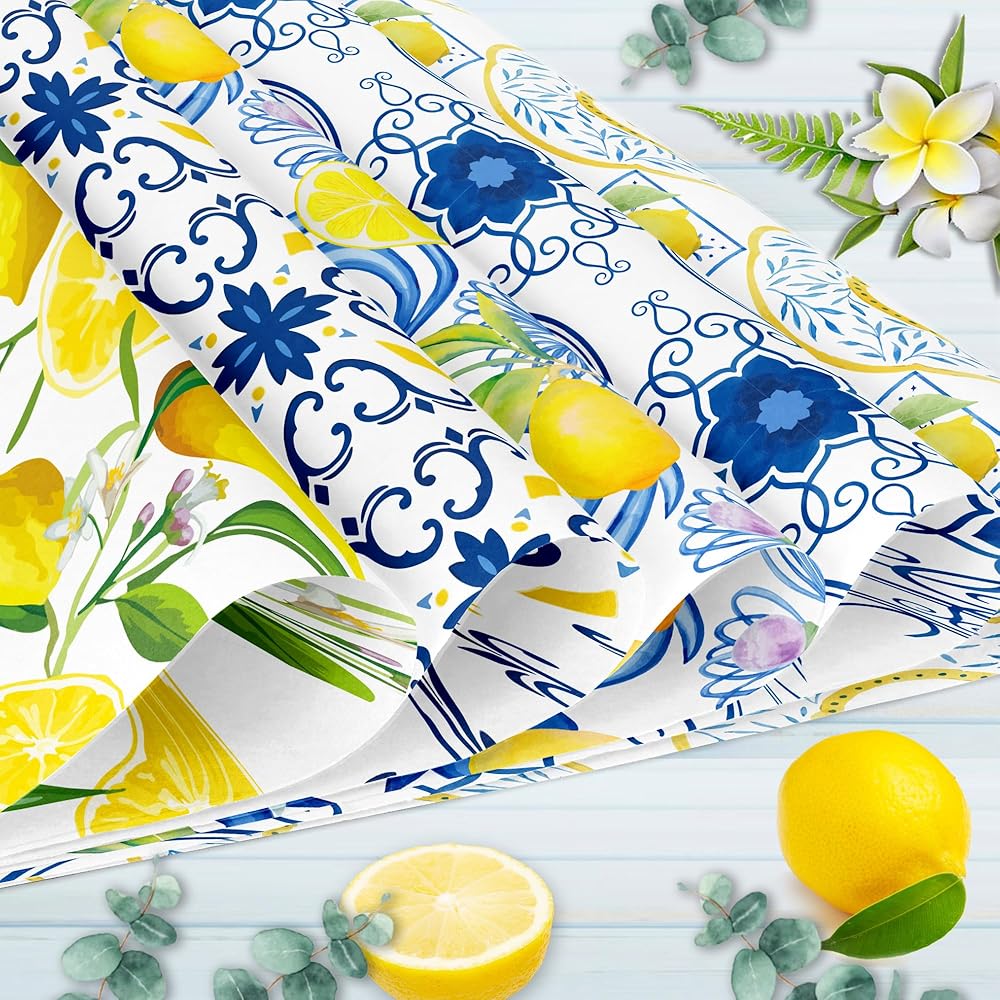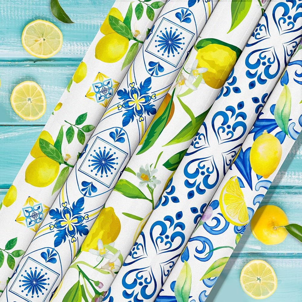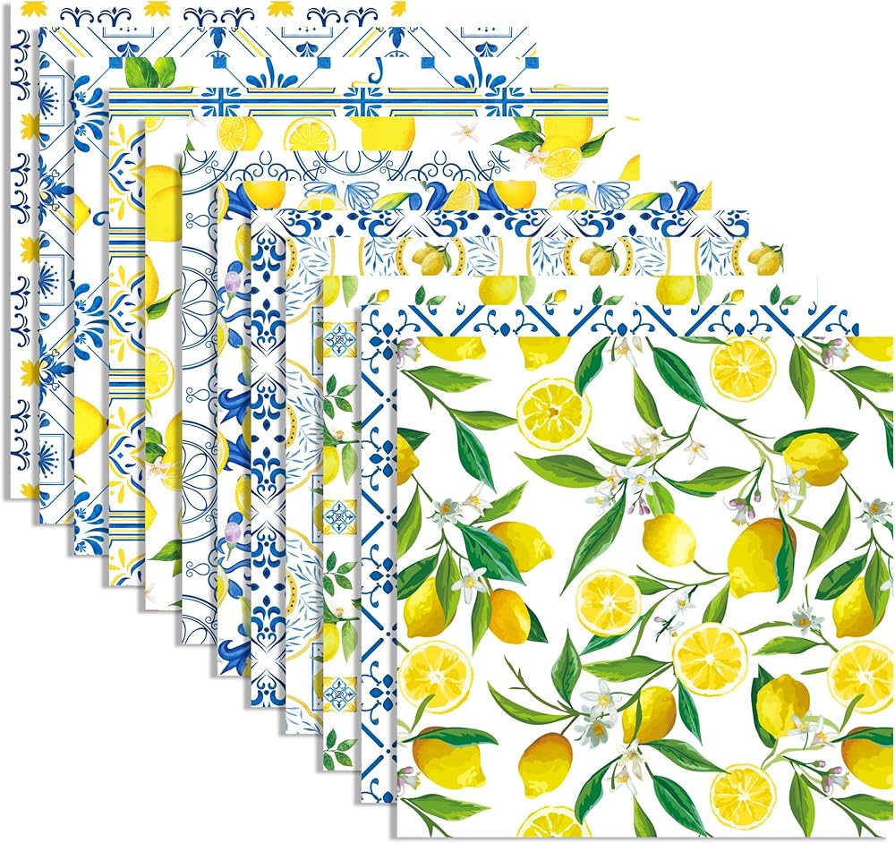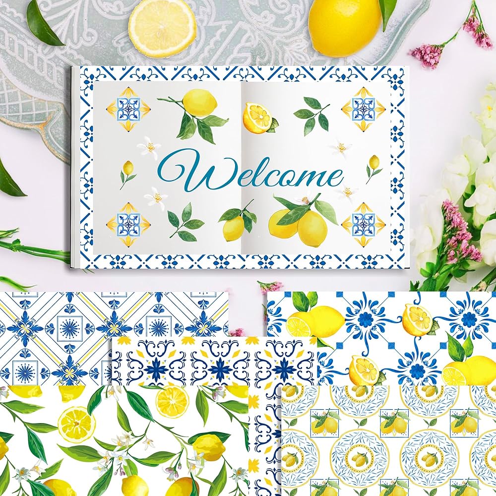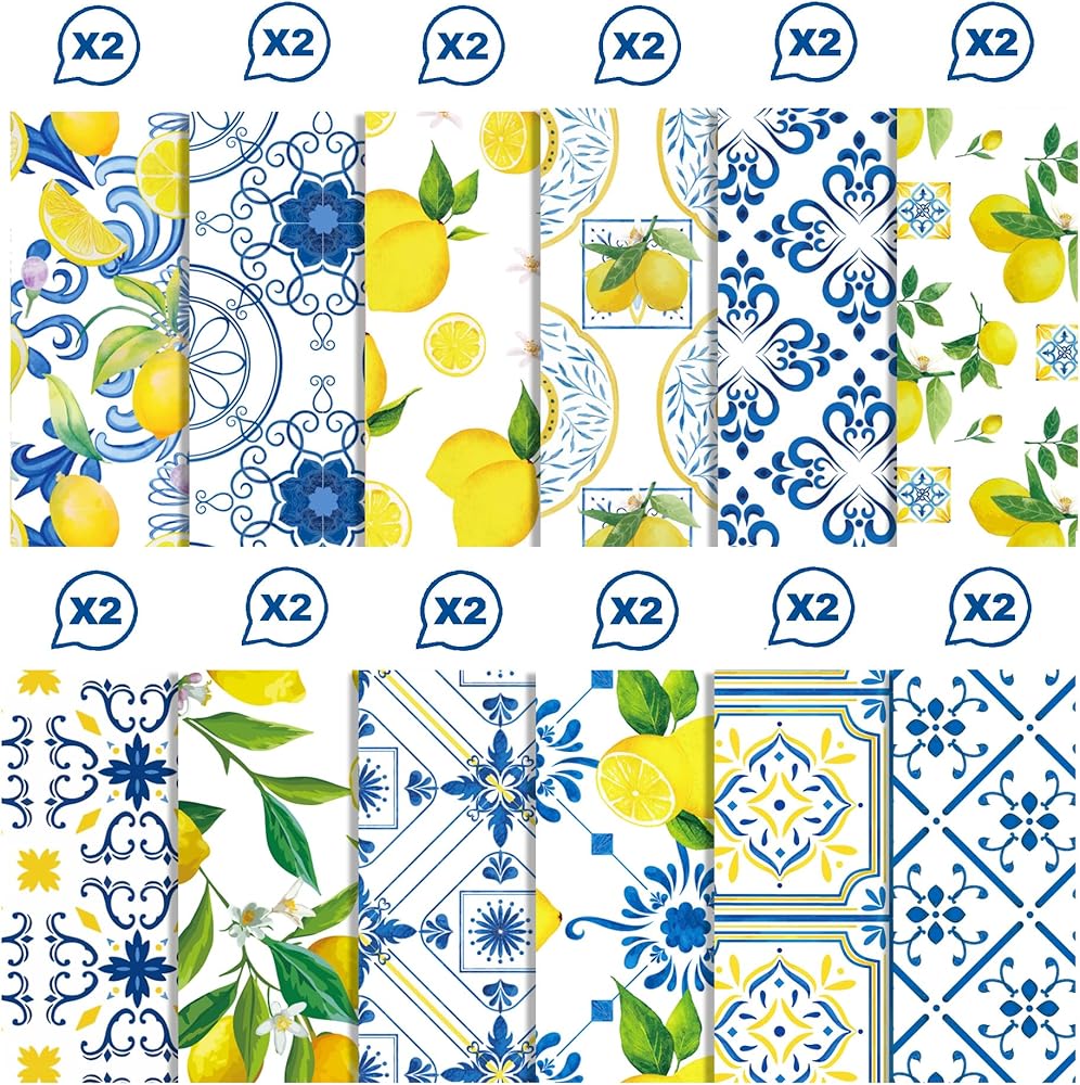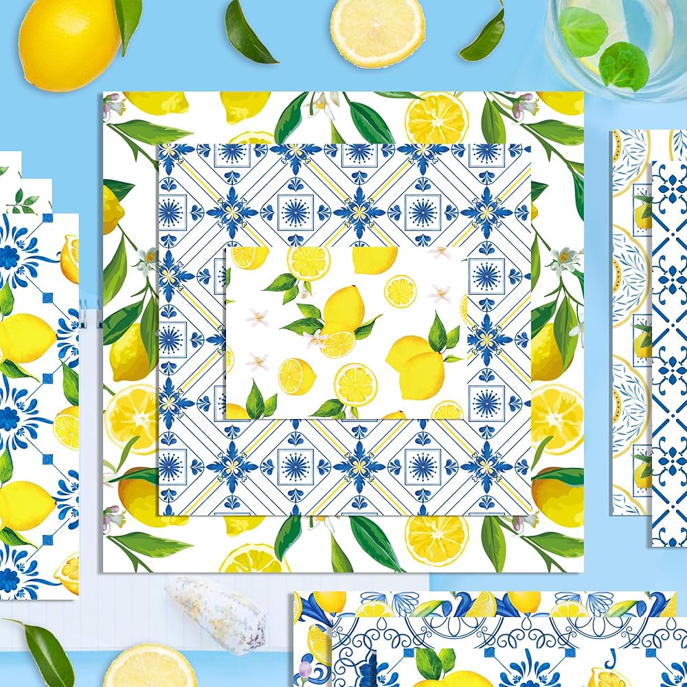 24 Sheets 12'' x 12'' Lemon Scrapbook Paper Pad Double-Sided Blue Tiles Yellow Lemon Patterned Decorative Craft Paper for Card Making Photo Album Journal DIY Craft