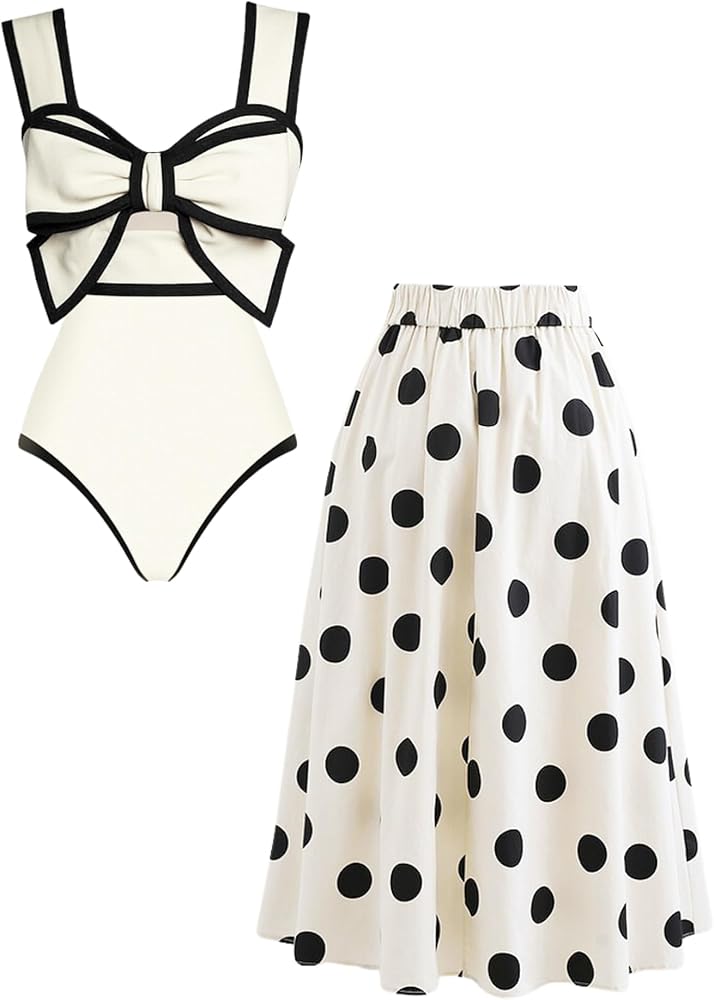 FLAXMAKER Black and White Swimsuit Bow-tie Decor Women's Polka dot Print Skirt One Piece Bathing Suit with Skirt