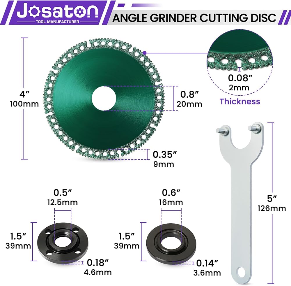 FITS ALL ANGLE GRINDERS - With 4 inch (100mm) diameter, 0.078 inch (2.0mm) thick, 0.79" (20mm) inner hole. This indestructible disc is compatible with all angle grinders for smooth cutting, chamfering and grinding of PVC pipe, color steel tile, thin-walled pipe, stainless steel, color steel tile, square pipe, angle iron, steel within 20mm marble, wood, ceramics