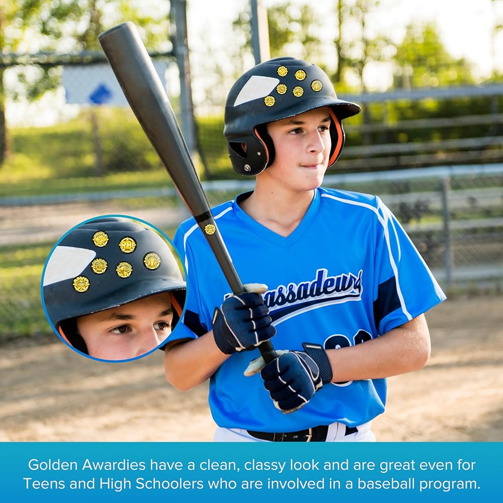 ⚾️ EXCELLENT SIZE FOR THIS YOUTH SPORTS STICKER: Measuring at 1.25 inches in diameter, these baseball achievement decals are the perfect size for any helmet or water bottle. The colored version has a clear background so that the players natural baseball helmet color can still shine through. Now the Awardies Shiny Gold sports decals...well these just shimmer in the Sun and look totally awesome. With black background and premium Shiny Gold print, your teen players will love to show these off.