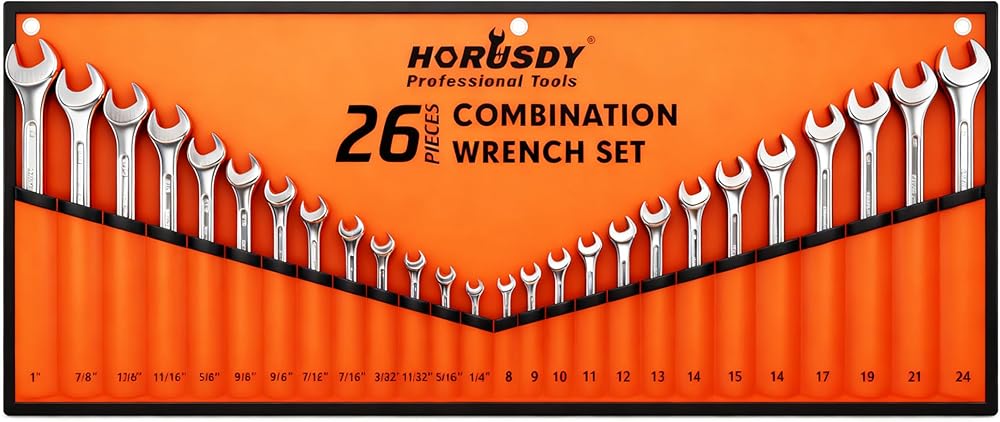 HORUSDY 26-Piece Durable Combination Wrench Set with Roll-up Pouch, Open End Wrench Set for General Household, Garage, Auto Repairs, SAE 1/4" - 1" and Metric 8mm - 24mm