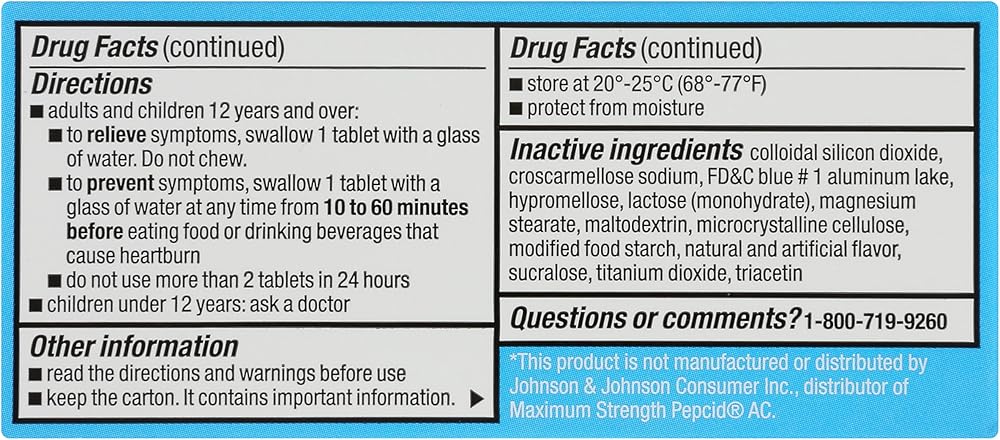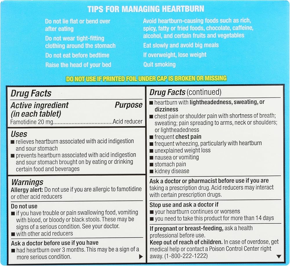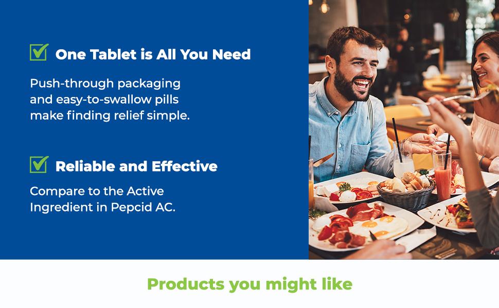 EASY-TO-SWALLOW & LOW DOSE: Just 1 famotidine 20mg dose tablet prevents and relieves uncomfortable heartburn due to acid indigestion. Take 1 tablet an hour before eating or drinking to enjoy all your favorite foods without fear.