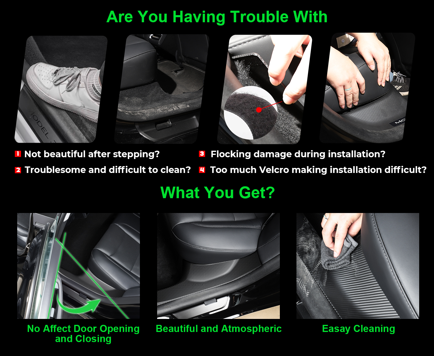 【Maximum Protection】Repeated use of Velcro damage to flocking is greater, BMZX for Tesla Model 3 Highland Door Sill Protector can be installed almost without using Velcro to protect the car's original flocking, of course, some places still need a small piece of Velcro to secure (Velcro in the box)