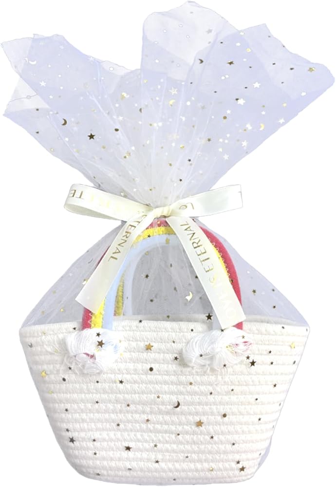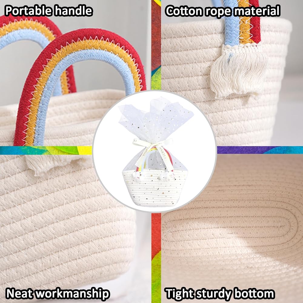 Small Woven Basket with Tulle Netting and Ribbon,Empty Decorative Chest Box, Baby Basket for Nursery, Small Rainbow Handbag for Girls,Cotton Rope Room Shelf Storage Basket