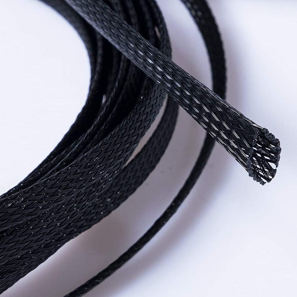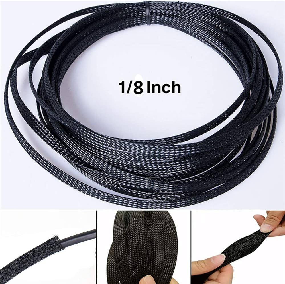 Wire Sleeves: This expandable braided sleeve made of black PET material, with a diameter of 3/8 inch and a length of 25 feet, is designed to organize and securely hold large-diameter cables up to 200%, including industrial automotive wire looms. It reduces complexity by keeping cables neat and orderly while preserving space around them. This sleeve is perfect for commercial, industrial, or home use and is durable.