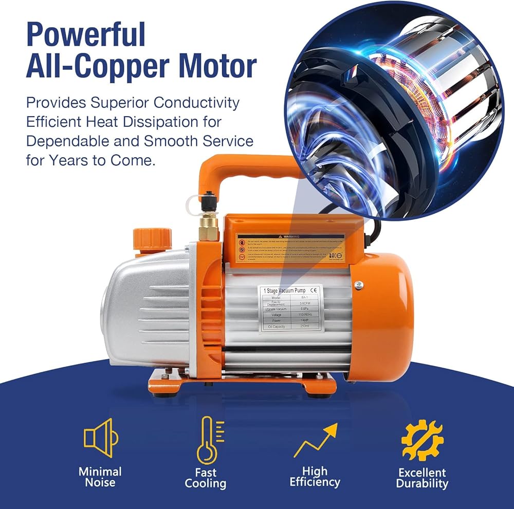 【𝟒𝐂𝐅𝐌 𝐕𝐀𝐂𝐔𝐔𝐌 𝐏𝐔𝐌𝐏】Alloy aluminum casing makes the single-stage rotary vane AC vacuum pump durable and long time use. All-copper wired motor and high volume cooling fan keep the pump running efficiently and for a longer life.