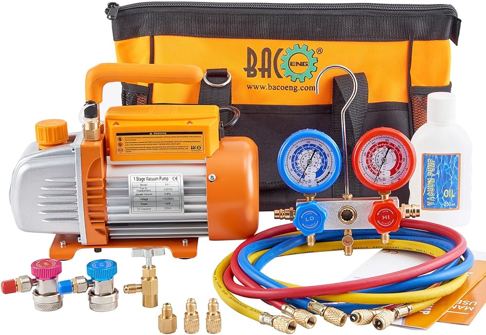【𝐑𝟏𝟑𝟒𝐚 𝐂𝐎𝐌𝐏𝐋𝐄𝐓𝐄 𝐊𝐈𝐓】Vacuum pump and gauge set for R134A HVAC/AUTO air conditioning refrigeration recharging system, with a large-capacity tool bag that can carry all the accessories needed at one time.