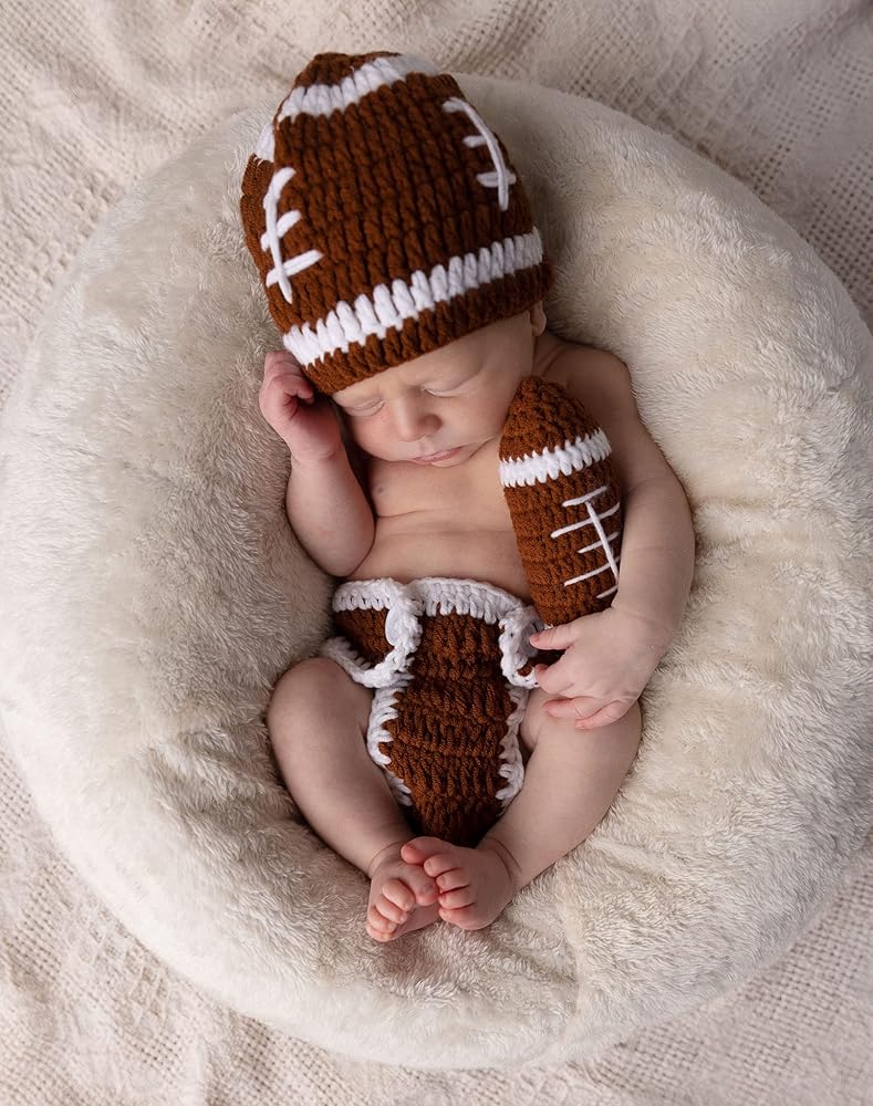 This football hat and pants set would be adorable for the tiniest football fans first portrait or just cheering on our favorite team. Suit up your little for her newborn photo shoot in this handmade crochet football outfits. It makes the perfect newborn photo prop and also a great baby gift.