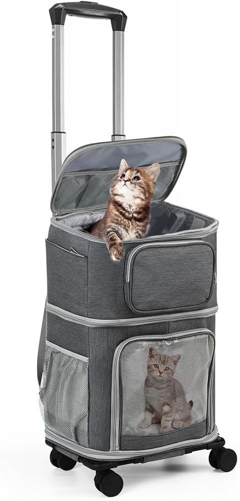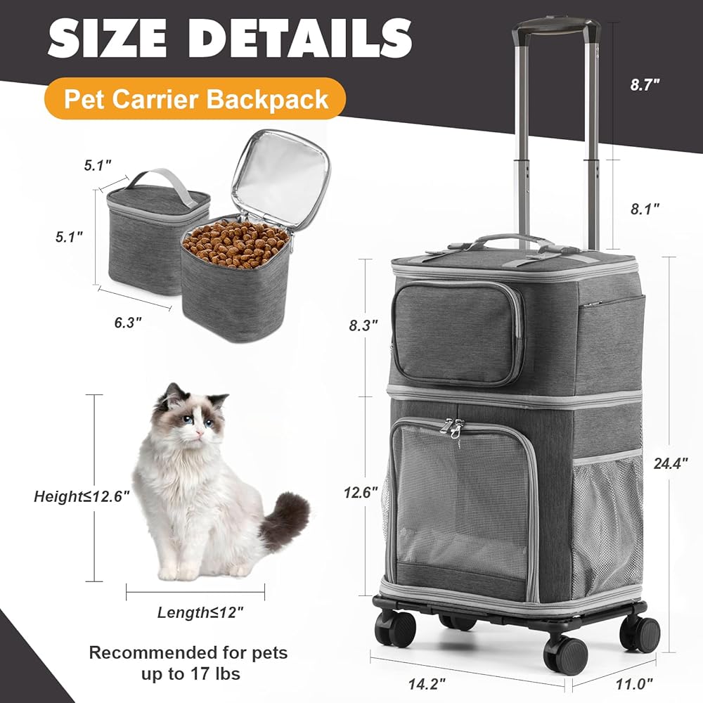 حاملة الحيوانات الأليفة على العجلات من فانانسا، حاملة قطط مزدوجة الحجرة 2 في 1 قابلة للفصل مع عجلات للقطط الصغيرة والكلاب والجراء، حقيبة ظهر للقطط المتدحرجة لقطتين، مثالية للسفر/المشي/التخييم