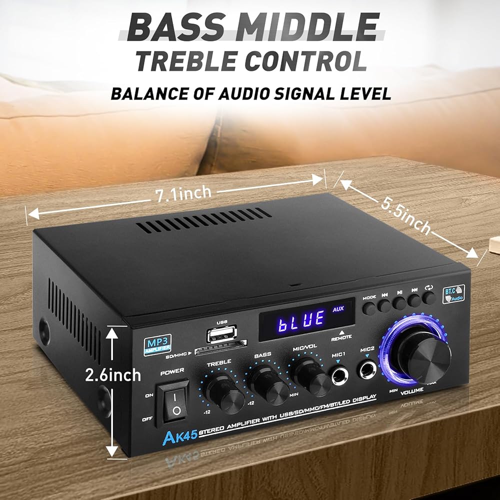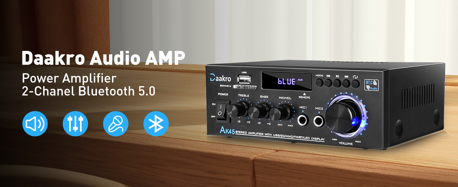 AK45 Pro Home Audio Amplifier Receivers with Bluetooth 5.0-2 Channel 100W Max Power Home Theater Stereo with USB, SD, FM, 2 Mic in,Stereo Audio Amplifier Receivers for Studio,Home,Karaoke