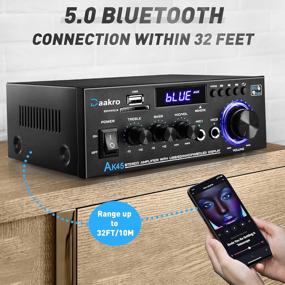 【☑️Multiple Input Modes】The audio amplifier supports various external signal sources:Connect your music streaming devices like pc/mobile/laptop with Bluetooth, RCA & MIC Input. It also supports USB Port, SD/TF Card port & FM Radio. Just enjoy your music the way you want to. (NOTE : Please keep the distance within 16.4ft/5m between the device and amplifier without any wall blocking. But if you are connecting with PC devices, please keep the distance within 6.5ft/2m.)
