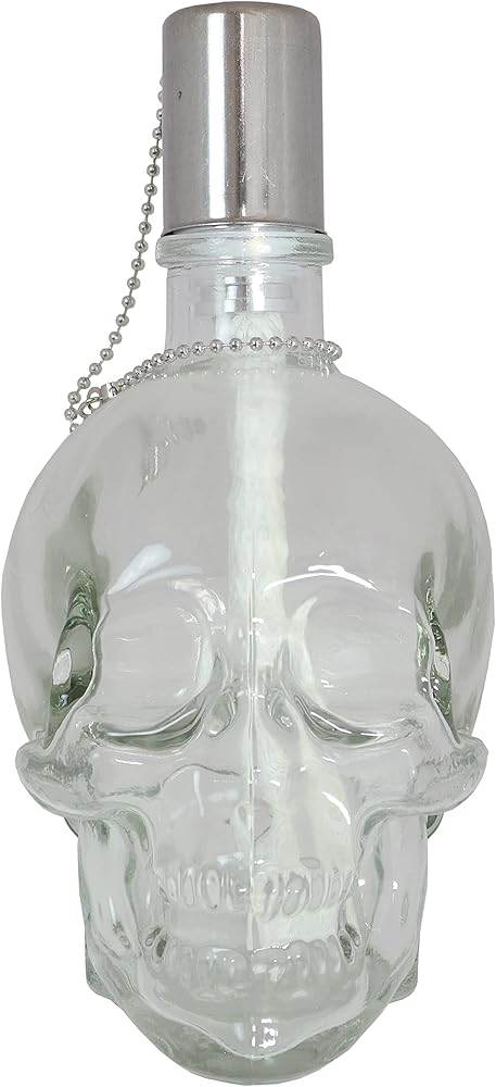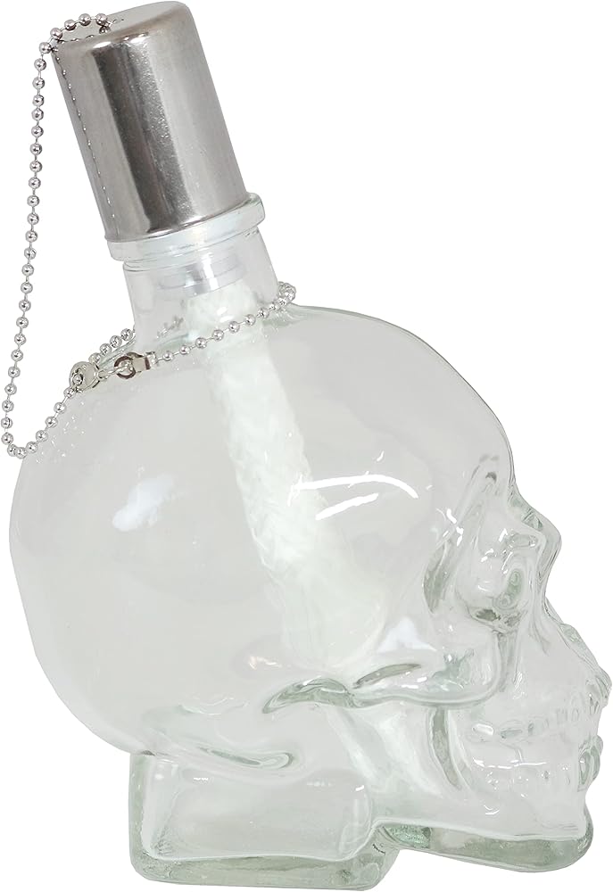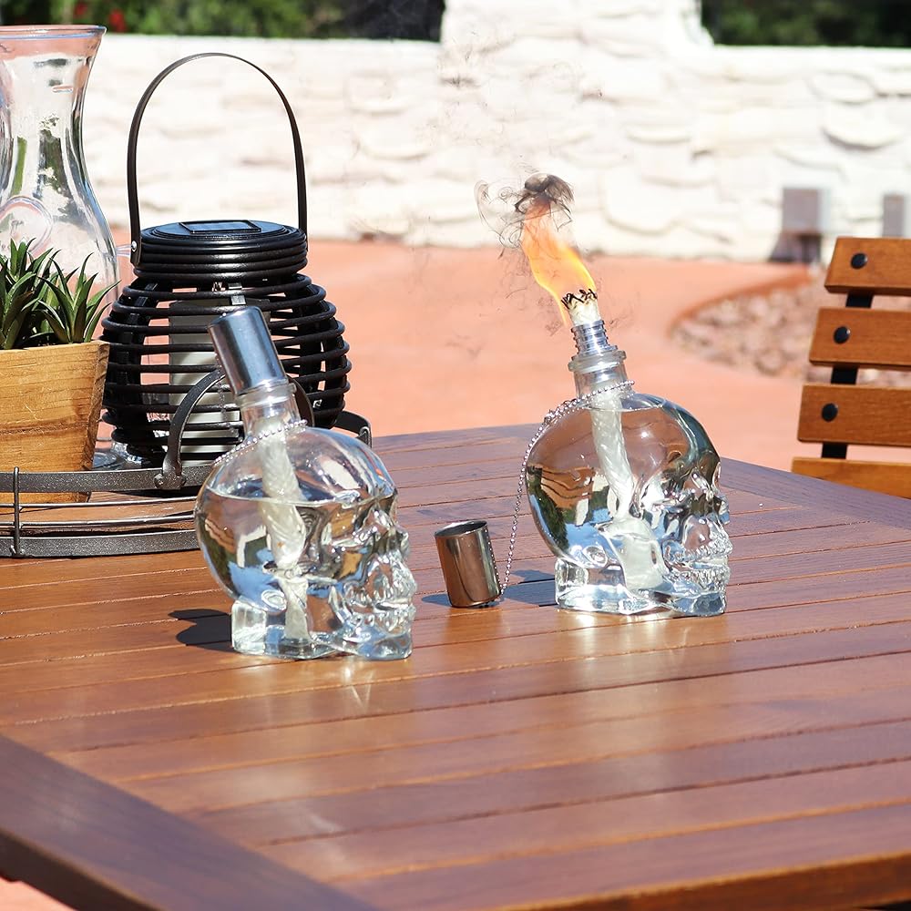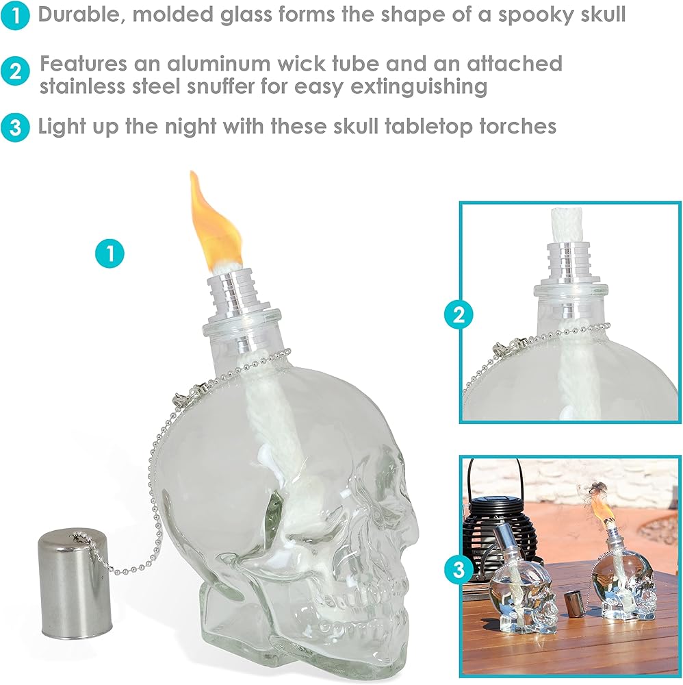 Unique glass construction: These table torches feature an intricately detailed, molded glass design in the shape of a human skull. Each torch has an aluminum wick tube, an attached stainless steel snuffer for easy extinguishing, and long-lasting fiberglass wicks.