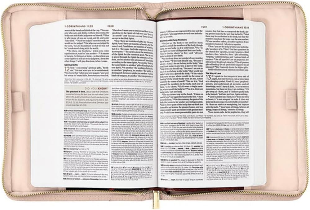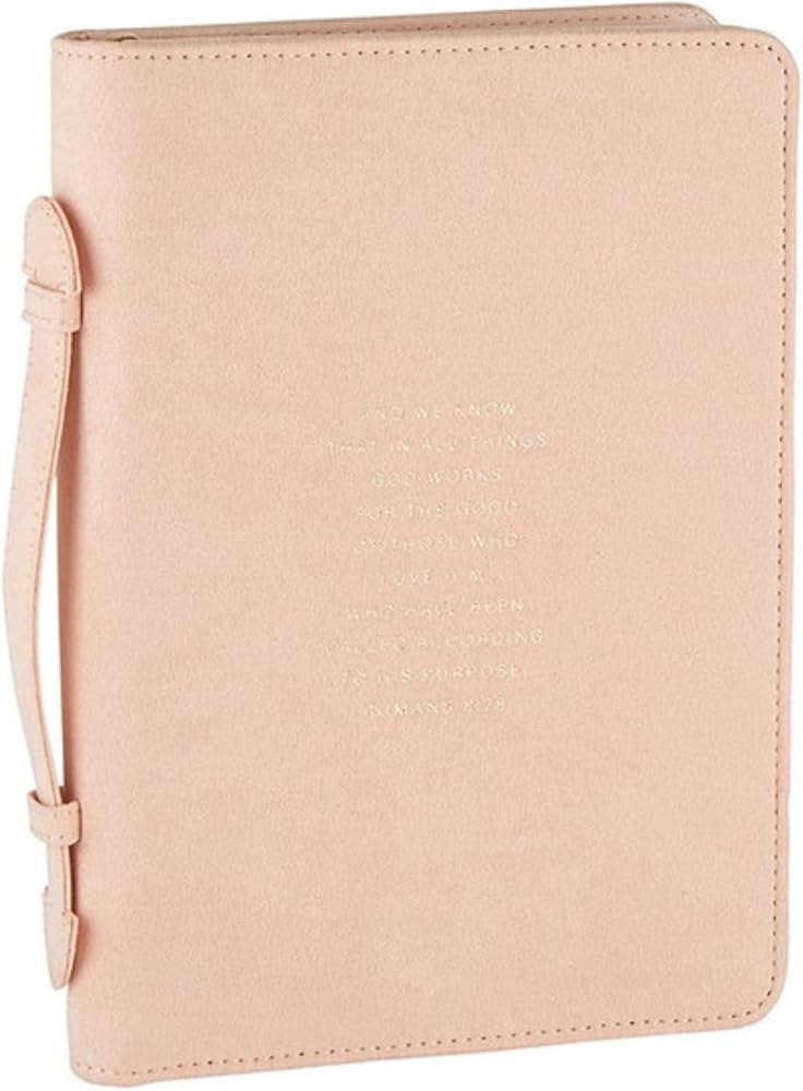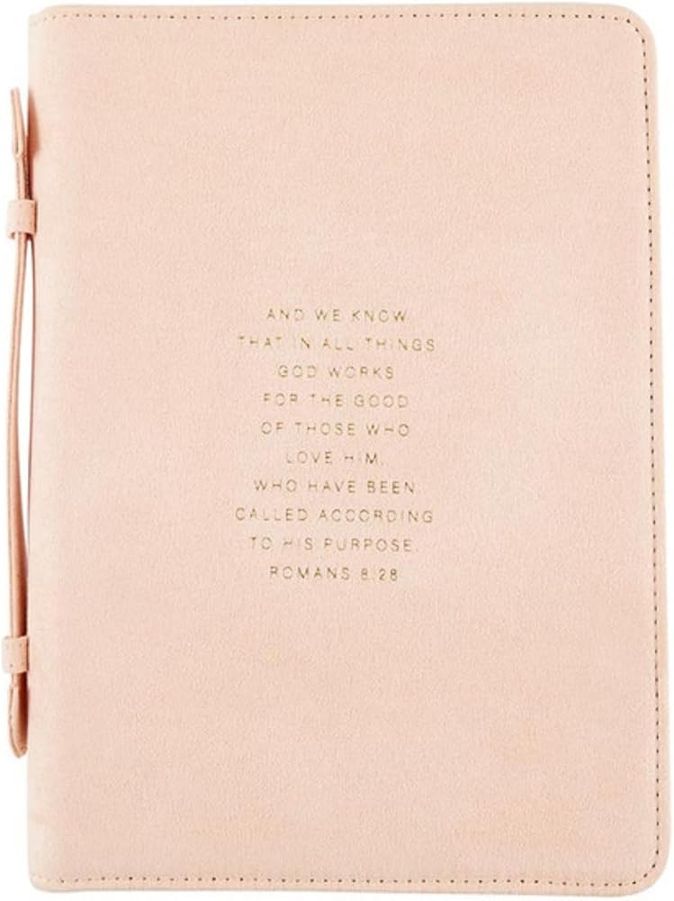 PEACH COVER WITH GOLD ZIPPER: Gold foil scripture reads "And we know that in all things God works for the good of those who love Him, who have been called according to His purpose - Romans 8:28"
