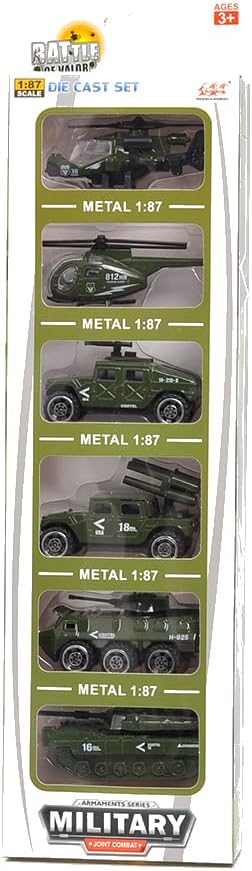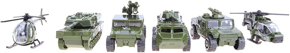 6 PACK | Play set comes with 6 unique vehicles. Tank, Truck, Panzer, Light Anti-Air Vehicle, Attack Helicopter, and Scout Helicopter.