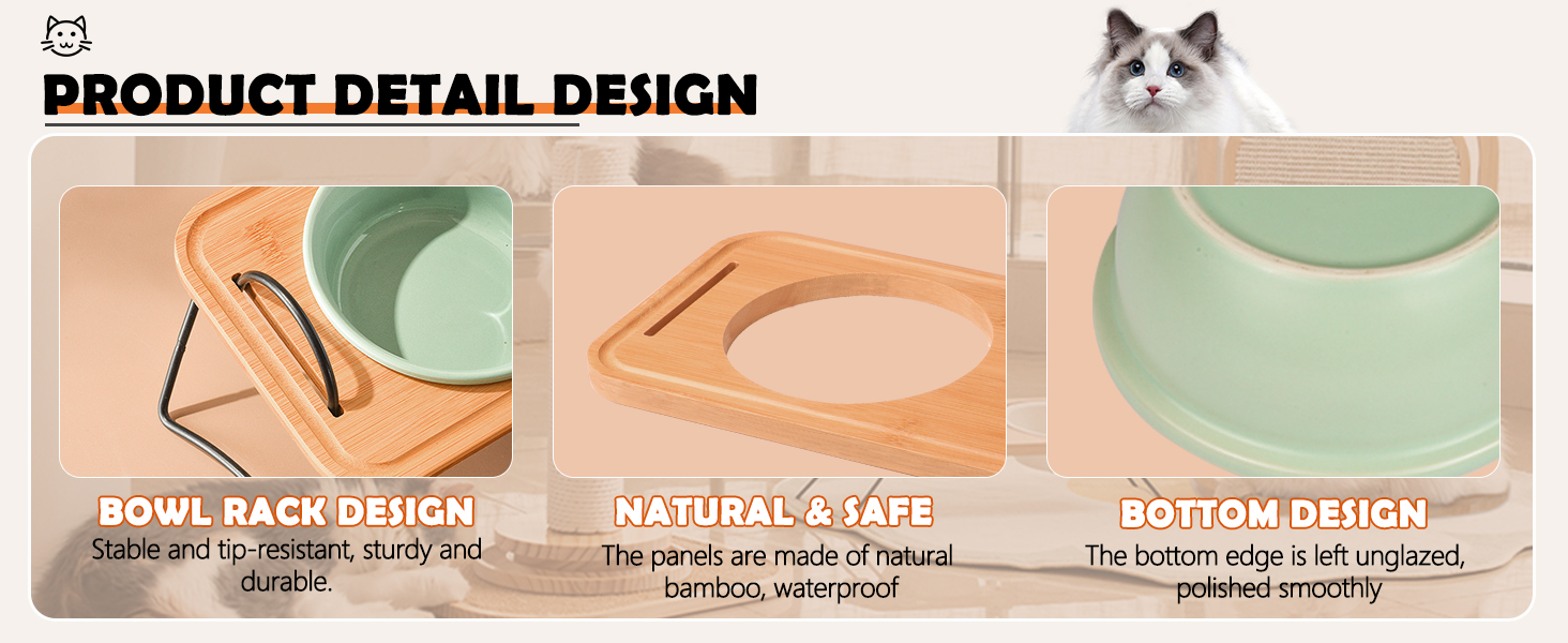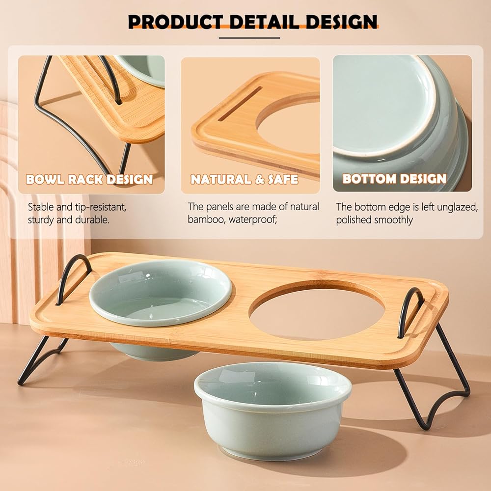 Durable and Easy to Clean: Our elevated cat bowls are sturdy and designed to last, made from a combination of bamboo, stainless steel, and ceramic. The raised cat bowl can be easily removed and washed in the dishwasher.