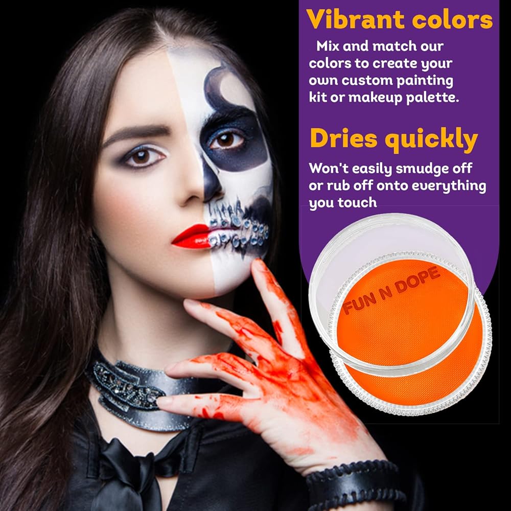 Are you looking for the highest quality water-based professional body and face paint? Fun N Dopes' full line of 10 matte colors PLUS our Rainbow split cake ensures you'll have any color you need to create wonderful body art and face painting creations. Each paint cake can be activated with a little water and stirred until your desired consistency is reached. Like standard paint, you can even mix different colors or add white to create your perfect custom paint. Because we use water-based paints, it's safe for your skin and washes away with soapy water or baby wipes. EASY TO USE. All our body paints can be used with either a flat brush, angle brush, or sponge. After painting on your desired surface, allow it to dry for 5 minutes. After use, store paints in a cool dry place out of direct sunlight. Our amazing Rainbow split cake allows you to pick up multiple colors with one brush for amazing effects and designs. Get an amazing professional look, on your very first time using it. It's easy, no experience required! GREAT FOR ANY EVENT. Kids and adults will love the long-lasting non-greasy paints that don't rub off on everything you touch. That makes these face and body paints perfect for Halloween, Dia de Los Muertos, festivals, costumes, holidays, sporting events, carnivals, or even professional photo shoots. Avoid direct contact with eyes and mouth. Prior to full application, test on a small patch of skin. ECO FRIENDLY MATERIALS. Protect your family and the planet with our water-based paints that use natural ingredients. No weird synthetic dyes, oils, or petroleum-based acrylics. Join thousands of happy customers; Click Add-to-Cart to order your body and face paint Today!