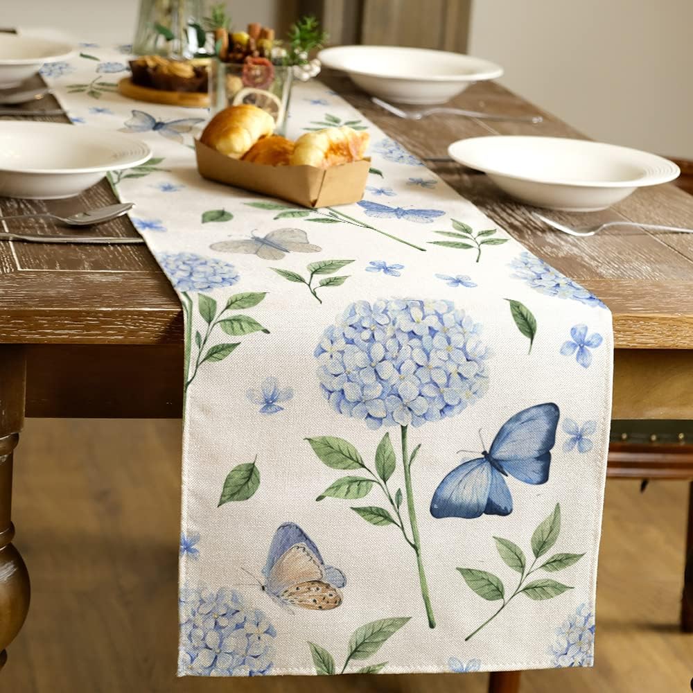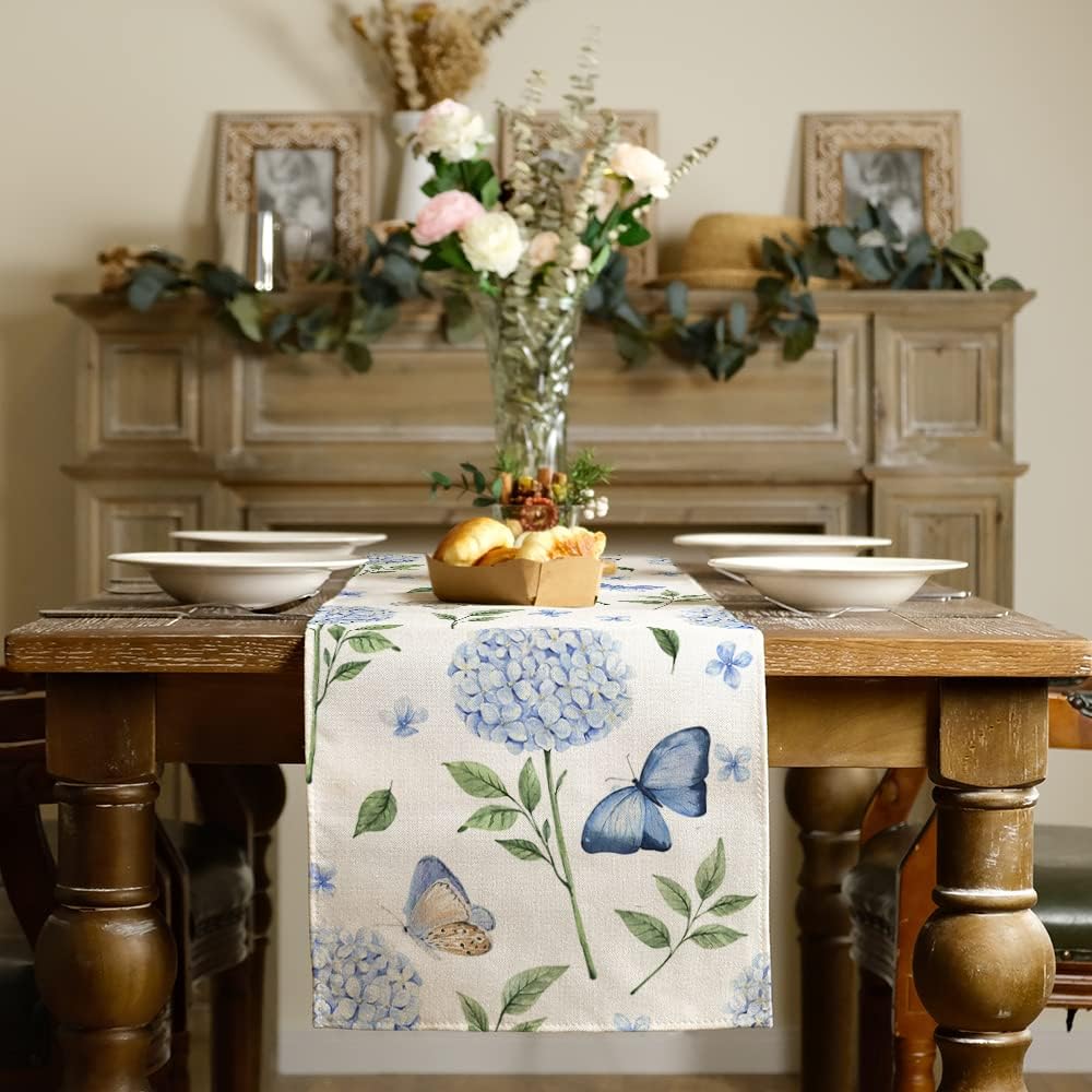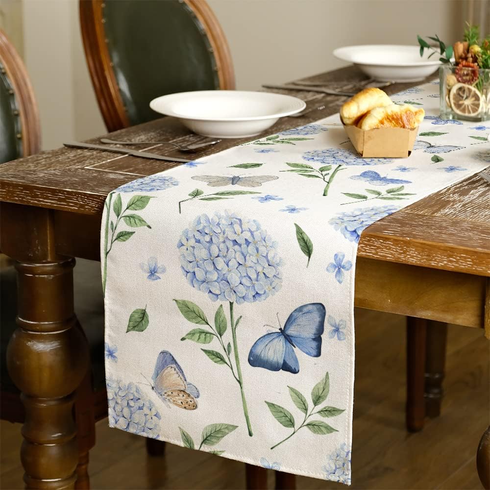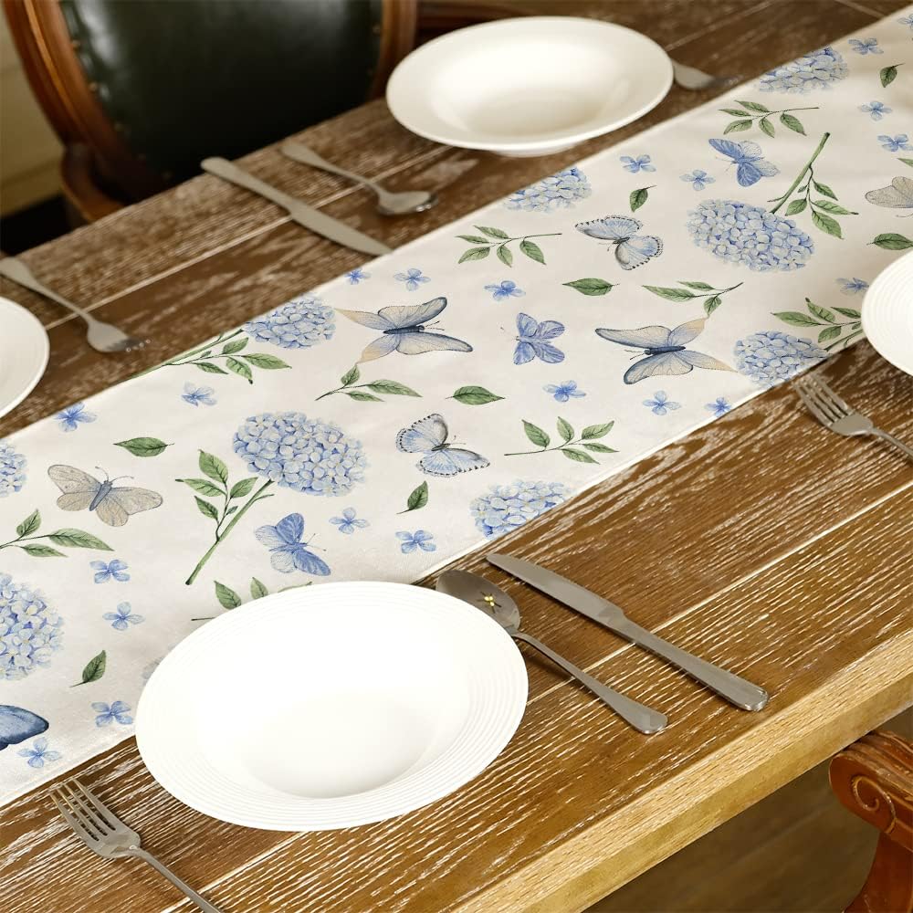 ARKENY Spring Flowers Hydrangea Blue Table Runner 108x13 Inches, Floral Butterfly Farmhouse Seasonal Indoor Outdoor Anniversary Table Decoration for Home