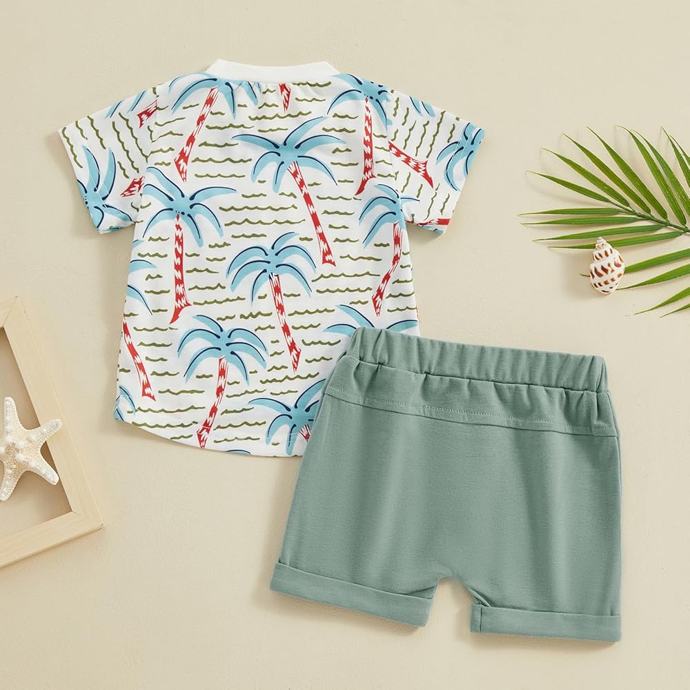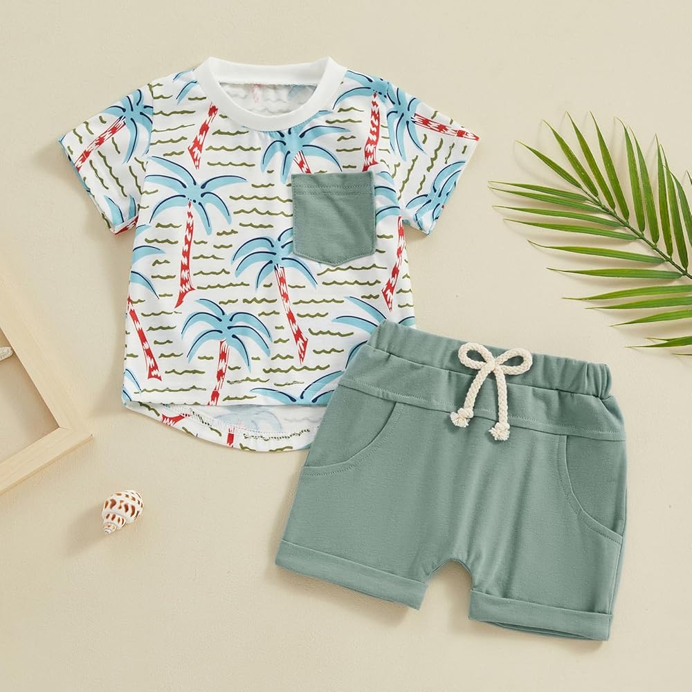 Toddler baby boy solid color shorts and palm tree print tshirt sets made of high quality fabric. Our baby boy's clothing summer sets are very soft and breathable! Great for summer.
