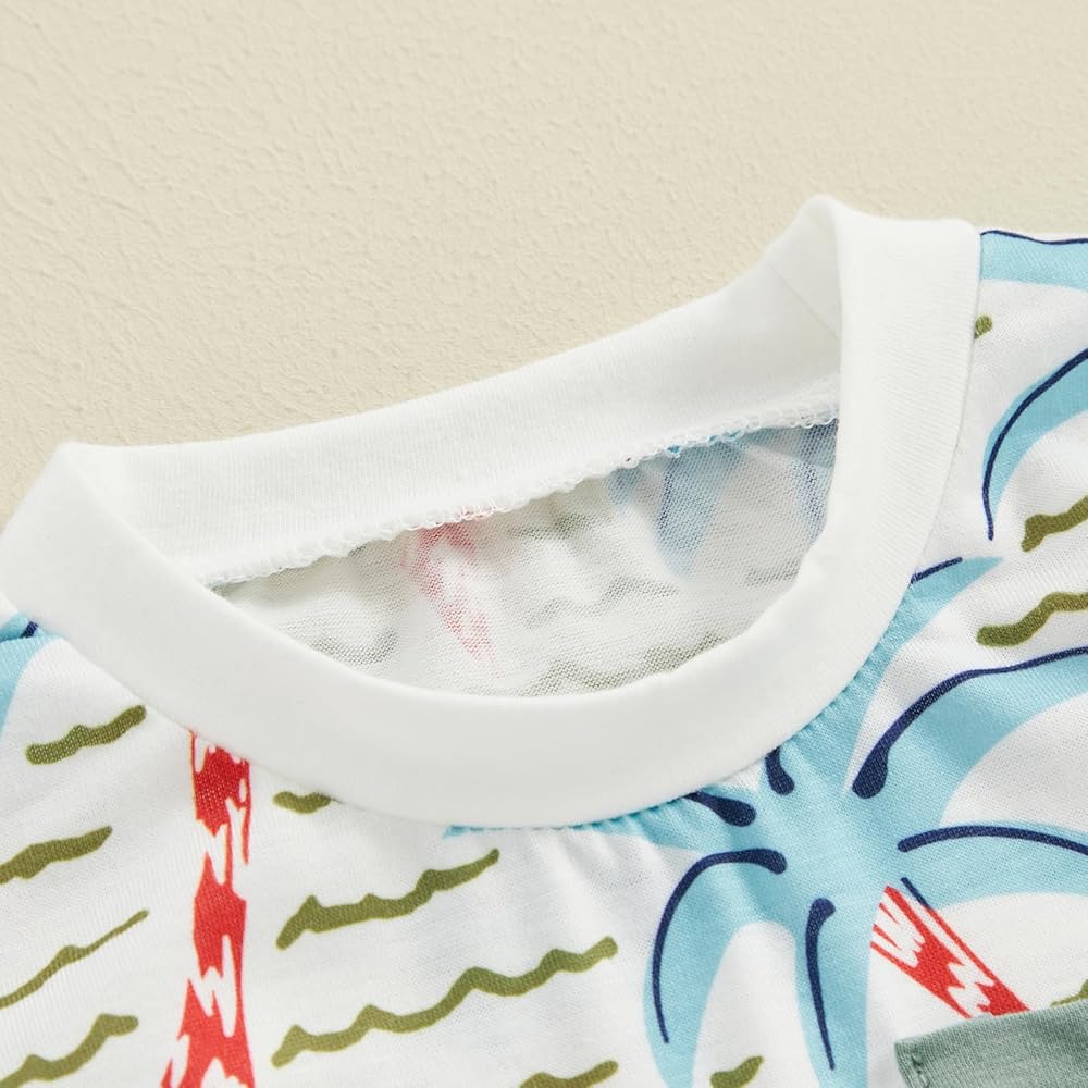 Stylish tropical pattern print short sleeve pocket tee shirts tops matching with drawstring solid color jogger pants with two side pockets, baby boy 2pcs shorts set, toddler boy summer shorts set. Simple yet stylish style with a lovely palm tree print baby boys t-shirt and shorts outfit sets. Easy to wear and a great fit for play without restraint.