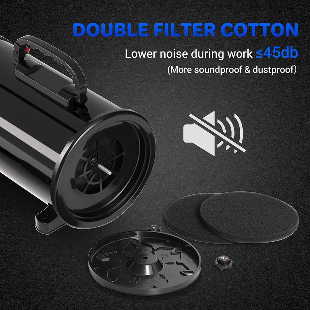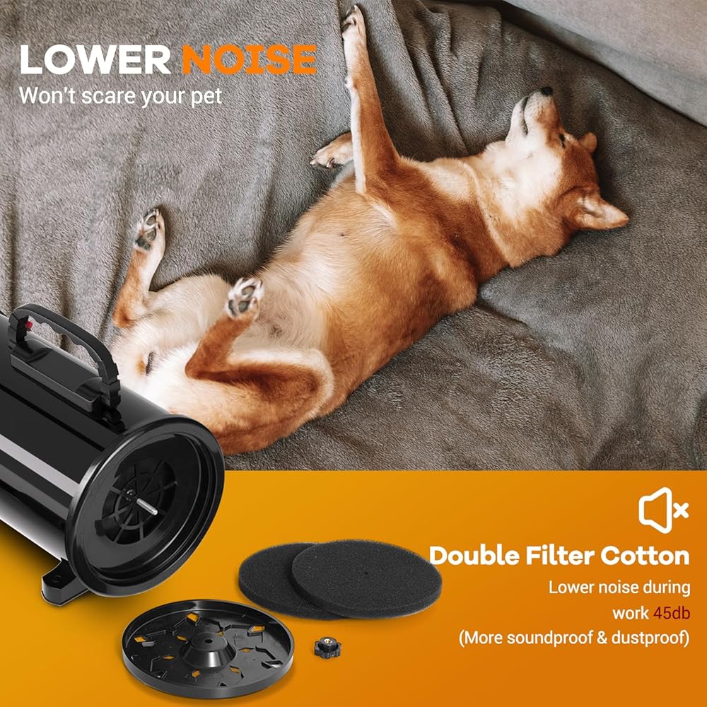 【1.2L Large Dust Cup】Our dog hair dryer & vacuum features a 2-in-1 design and is upgraded with a 1.2L dust cup, which can accommodate scattered pet hair, making grooming process cleaner and tidier. Operation is also very simple, just simply twist and open the lid of the removable dust cup after use and dump all the hair directly into the trash can.