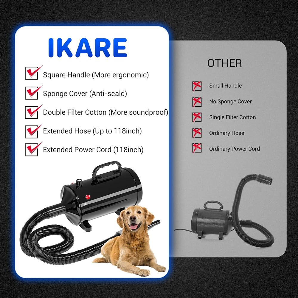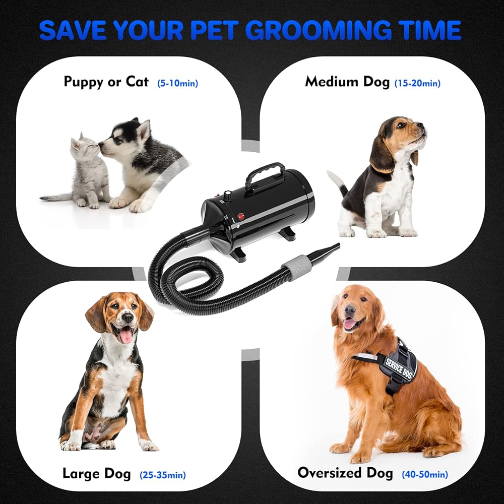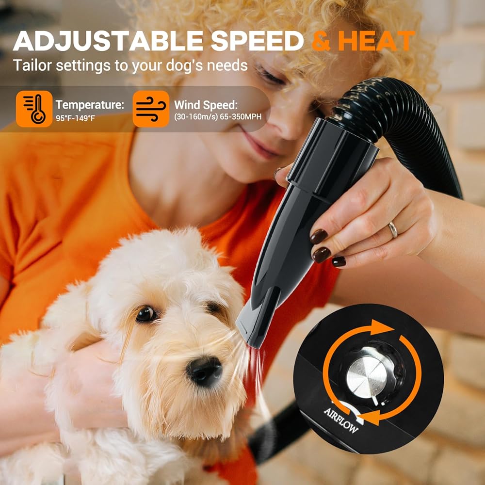 【Adjustable Airflow Speed & Temperature 】The dog grooming dryer has a steplessly adjustable airflow speed of 30M/S-90M/S, and two adjustable temperatures of regular 95 °F and heated 149 °F. You can choose the appropriate wind speed and temperature for your pet. If you want your pet's hair to dry faster and cause less damage, this dog dryer will provide you with great help.