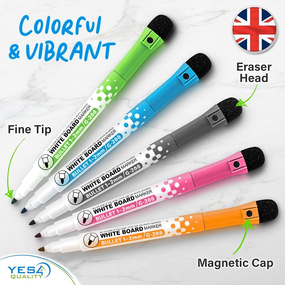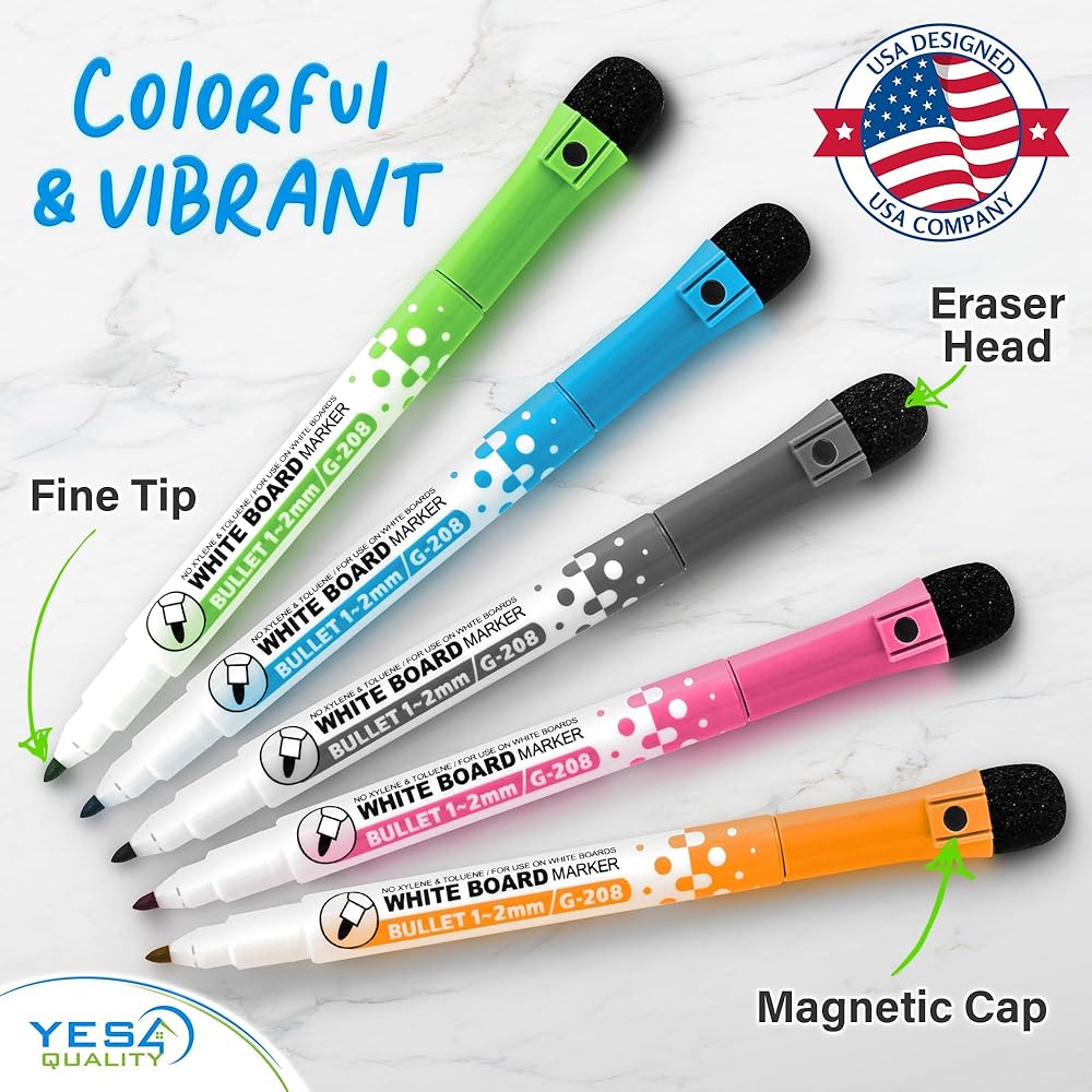 5 COLORFUL MARKERS - Make personalized notes & differentiate between tasks w/ 5 colorful dry-erase markers; Markers have eraser heads for cleaning convenience; Fine-Tipped for neat and pristine writing experience