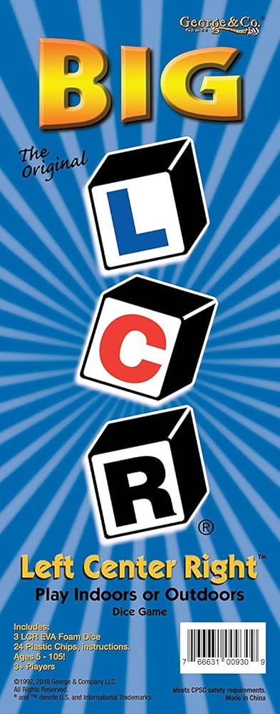 Just like it's original version, BIG LCR Left Center Right is a fun and fast paced dice game. Players roll the dice to determine where they pass their chips. The last player with chips is the winner and wins the center pot. The BIG LCR dice are made of high-quality EVA foam which makes it safe for any surface. The chips are made of a durable plastic. Item Dimensions: 16" H x 6" W, Foam Dice approx 5", Chips approx 5". Instructions included. Item weight 4 lbs. Play indoors or outdoors. Ages 5-105! 3+ Players George & Company LLC