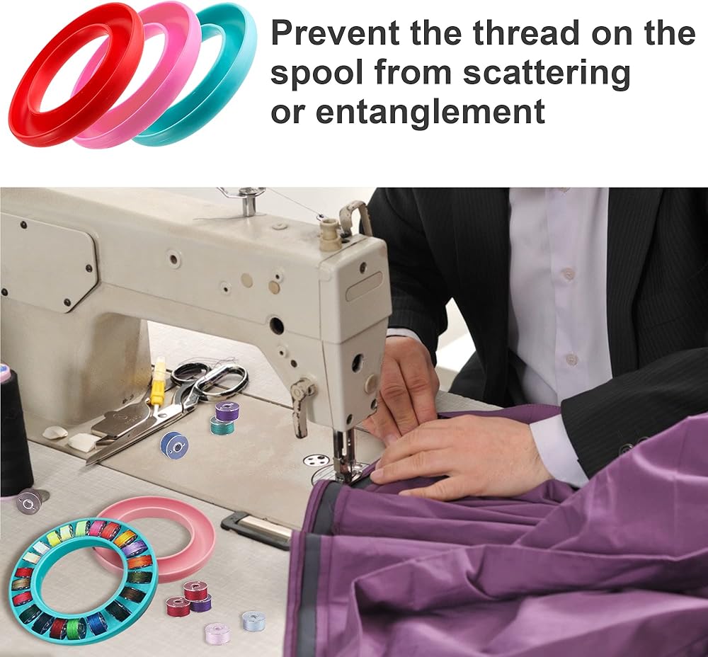 Package Contains: 3 Different Color Bobbin holders, each of purple, blue, beige and 24 Transparent Bobbins for Sewing Supplies in your daily life.3 Differnet color bobbin ring is convenient to help you storage different bobbins.