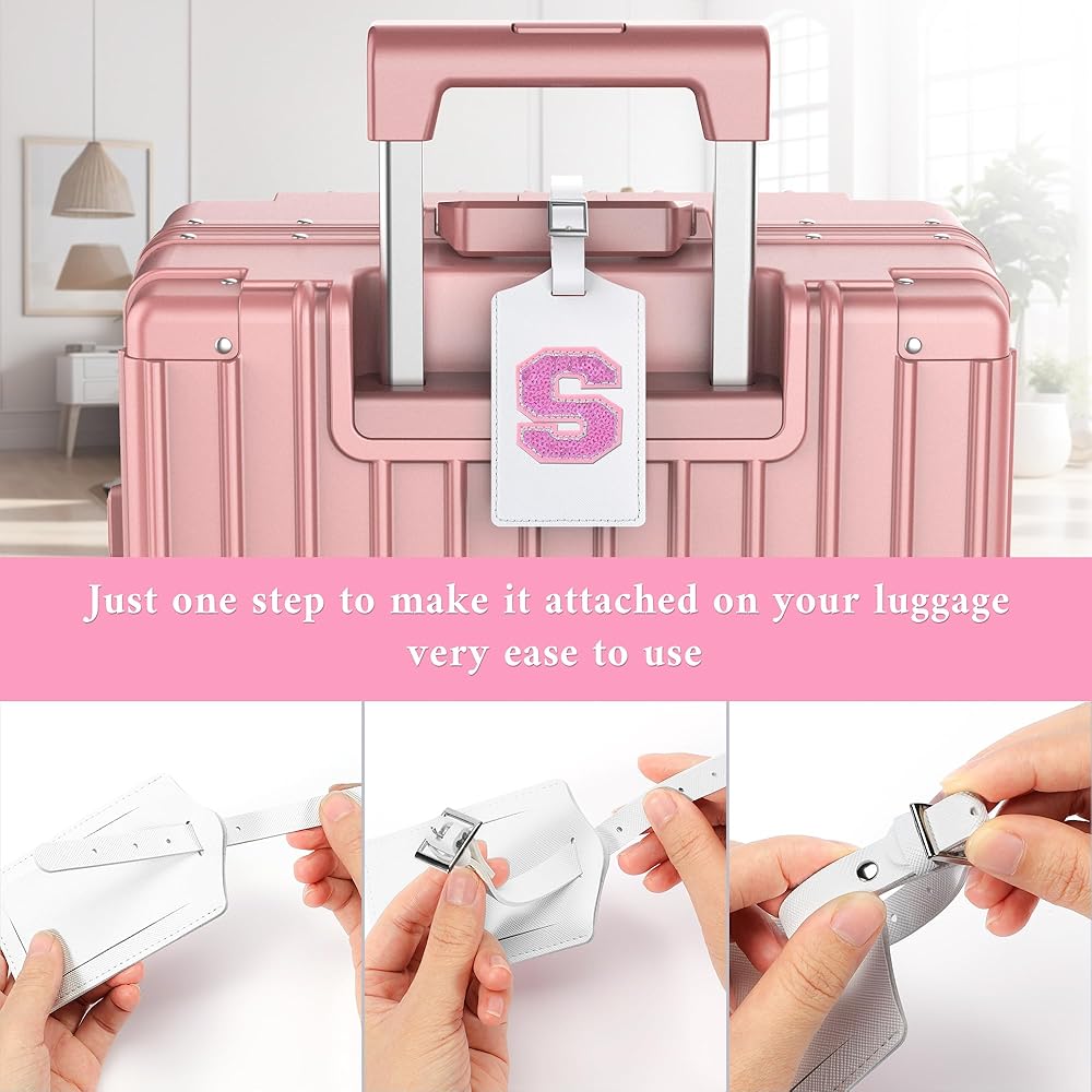 Sodsay 2 PCS Initial Luggage Tag, Luggage Tags for Suitcases Cute Sequin Letter PU Leather Travel Bag Baggage Tags Privacy Cover ID Label for Women Kids Teens Men(S, White Leather+Hot Pink Letter)