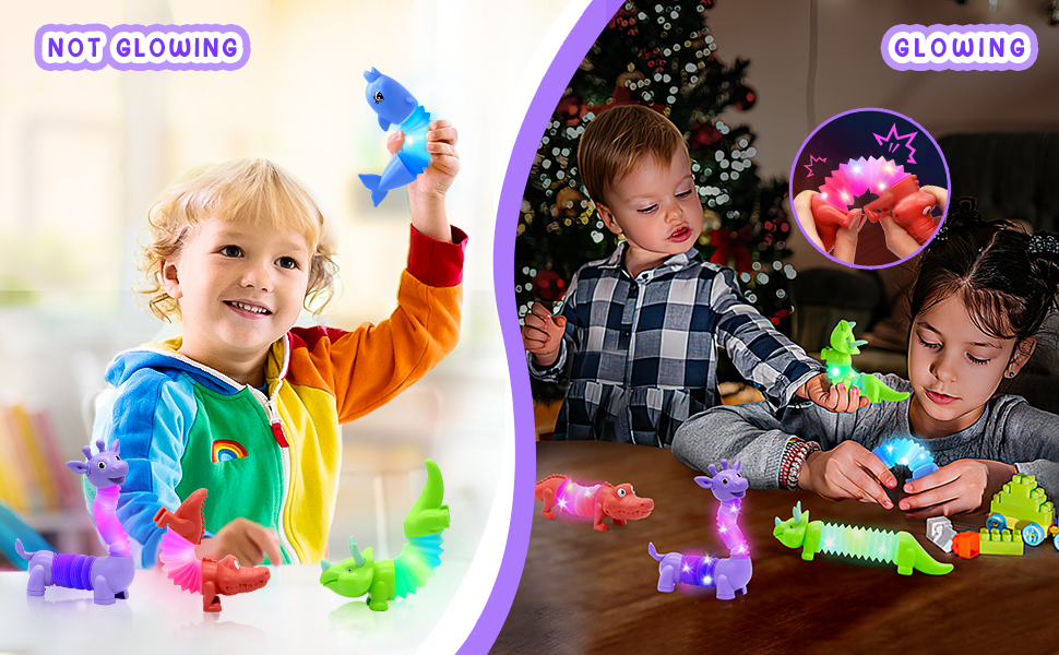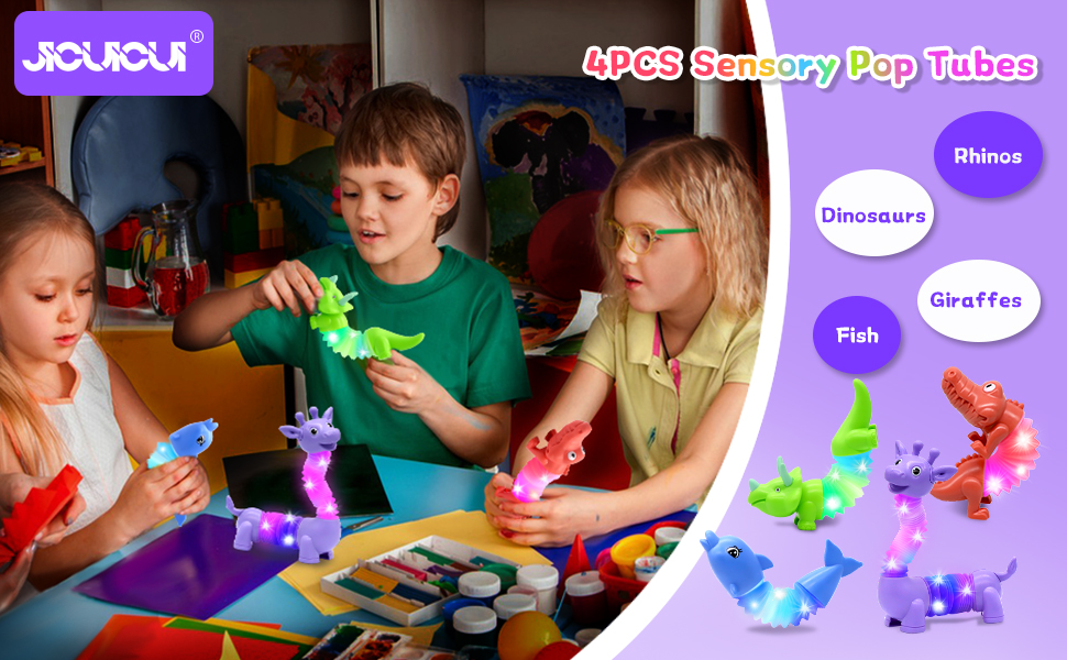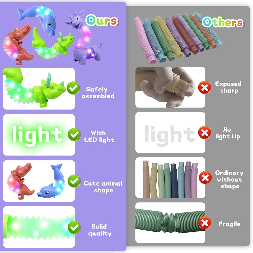 【LIGHT UP POP TUBES FIDGET TOYS】🐉JICUICUI pop tubes set comes with different animal toys and can be lighted up It will impress your kids and ensure countless moments of fun during the day. The head and tail can be stretchable, the tubes can be popped and stretched with a crisp sound when stretched, and different color combinations, are suitable for kids' party favors.