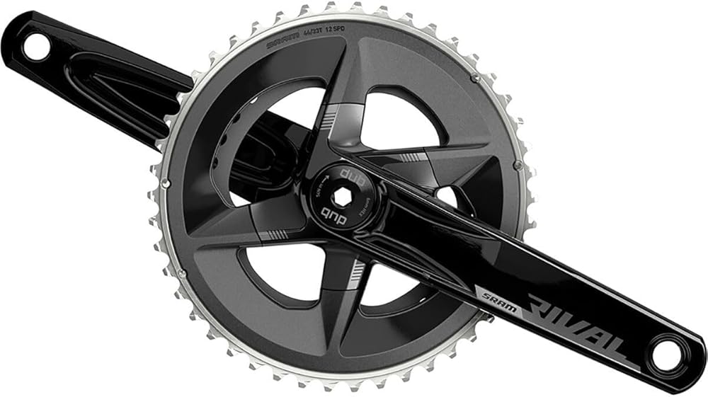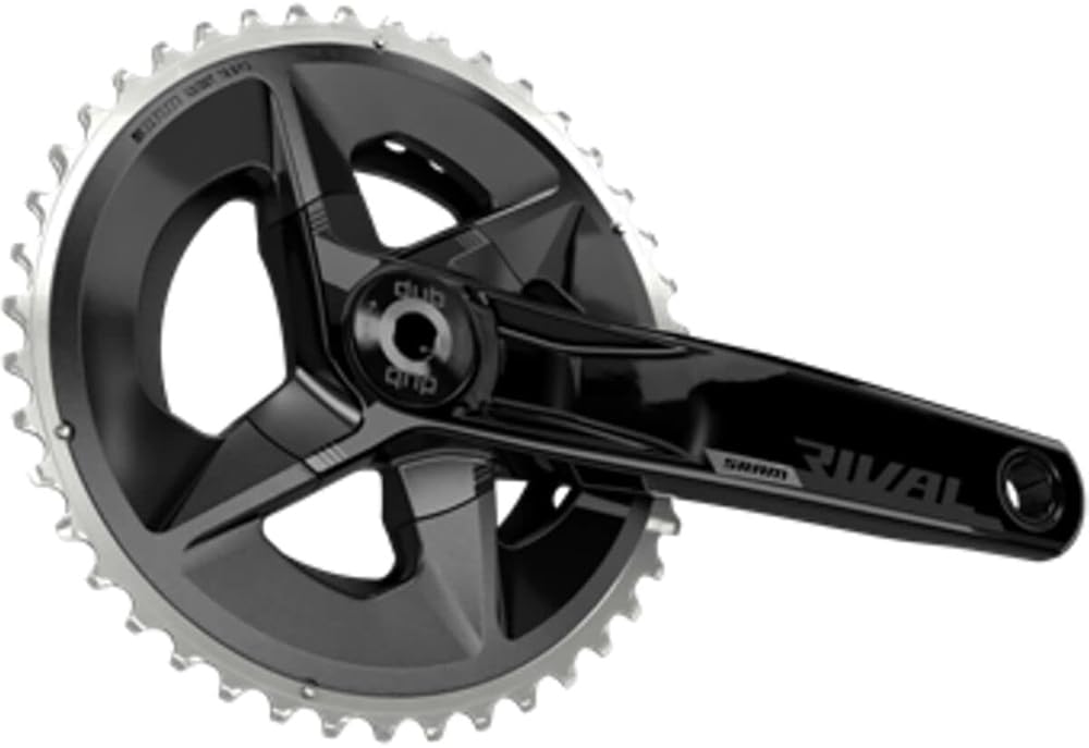 For a sophisticated design and consistent chain control over long periods of pedaling, we'd recommend the Rival 1x 12-Speed Crankset. It's SRAM's offering for cyclists in favor of a more simple and lightweight 1x setup, which allows us to run a tidy crankset. SRAM utilizes aluminum for the construction of the crank arms, which reduces weight while maintaining stiffness and strength for our benefit. We're also seeing the aluminum DUB spindle, which adds durability to the bottom bracket bearings, plus broader frame compatibility. A wide, 47. 5-millimeter crankset fits the largest gravel tires, and the longer DUB crank spindle accommodates both road and MTB width frame bottom bracket standards for cross-compatibility.