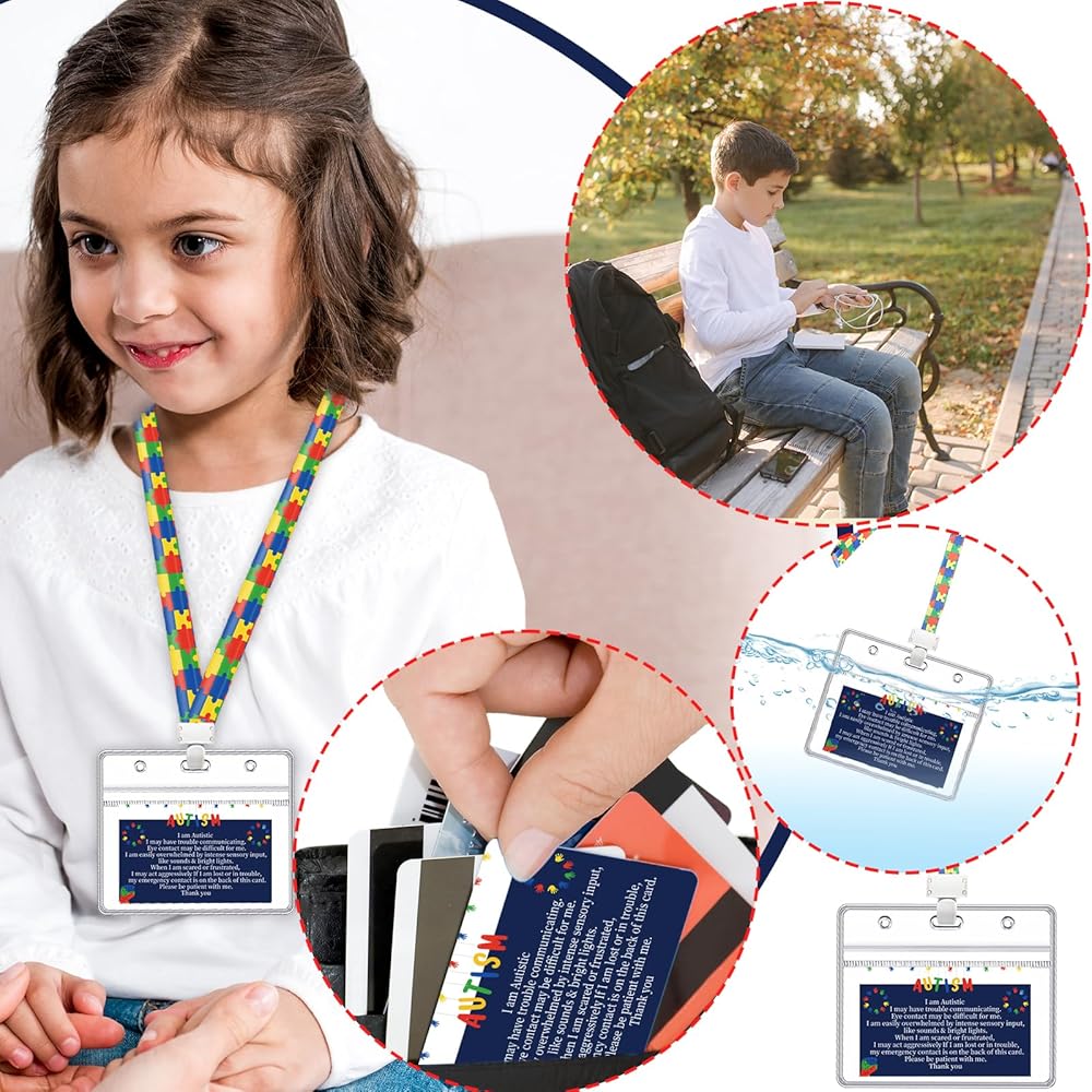 ❤️【𝐖𝐚𝐭𝐞𝐫𝐩𝐫𝐨𝐨𝐟 𝐚𝐧𝐝 𝐃𝐮𝐫𝐚𝐛𝐥𝐞】 These autistic emergency contact cards are made of hard PVC material, safe and sturdy, easy to write, and you don't have to worry about the cards getting wet in the rain; The autism lanyards are made of reliable fabric material, not easy to break or fade; Clear card holder is made of high-quality plastic. It is thin and light, easy to carry and use.