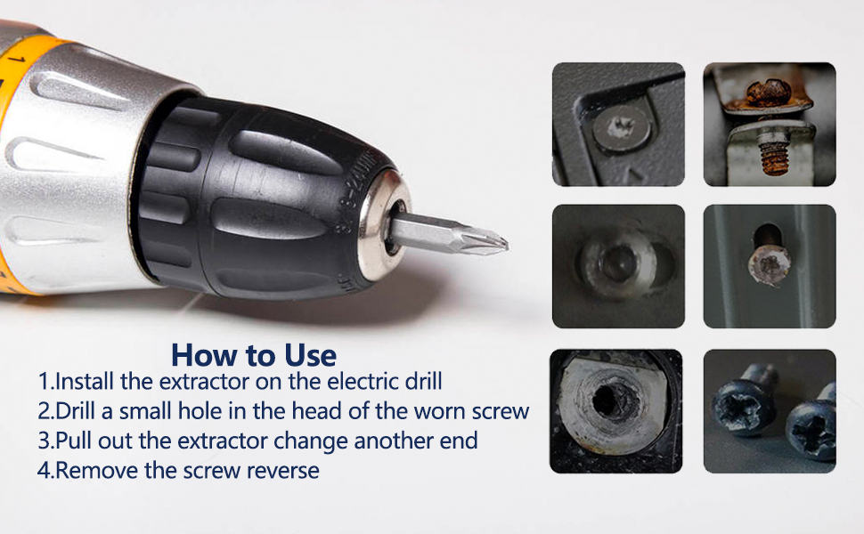 Easy to apply : Easy operation of in three simple steps: 1. drill; 2. flip the bits; 3. extraction. With our dynamic set of extractor drill bits, removing stripped, painted over, rusted or rounded screws & bolts has never been easier or more efficient!