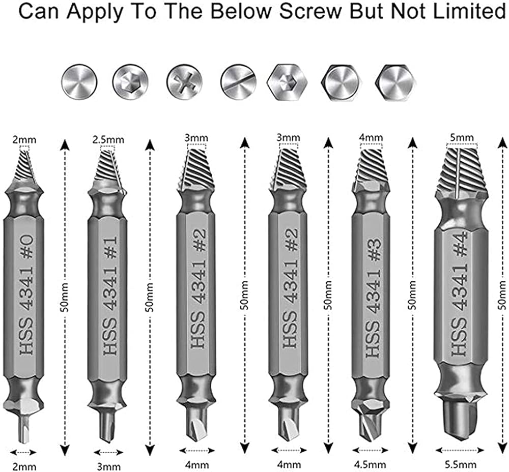 Damaged Screw Extractor Kit, Stripped Screw Extractor Set Tool Set with the specifications of #0, #1, #2, #2, #3, #4 Easily and Quickly Remove Common Sizes of Damaged, Broken or Stripped Screws