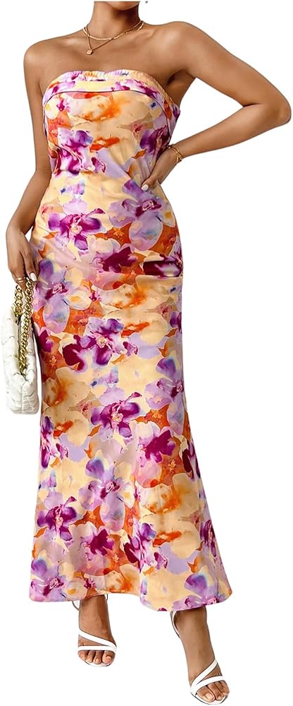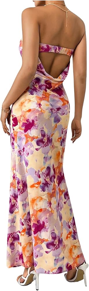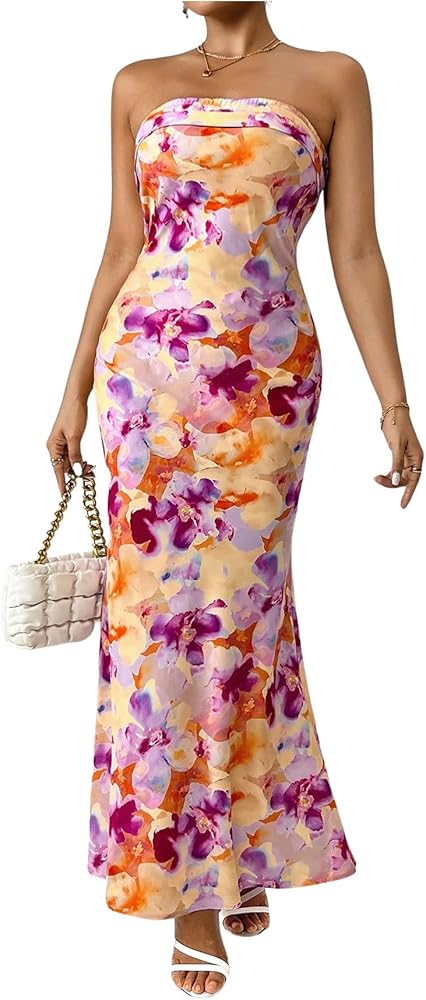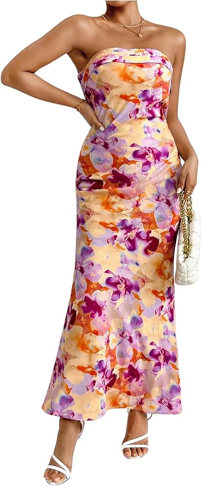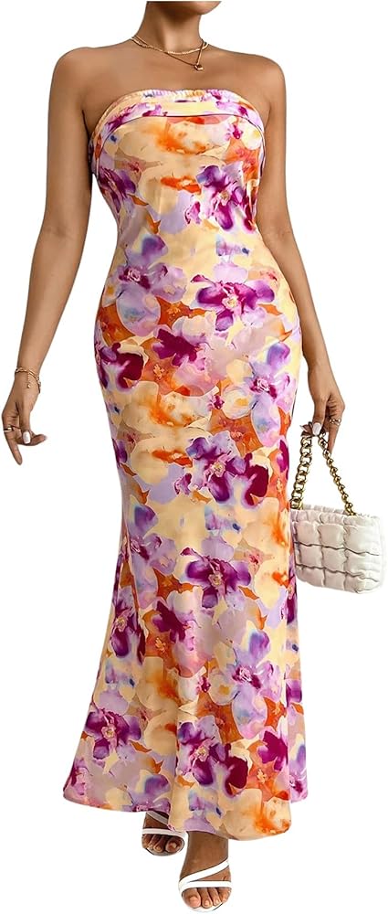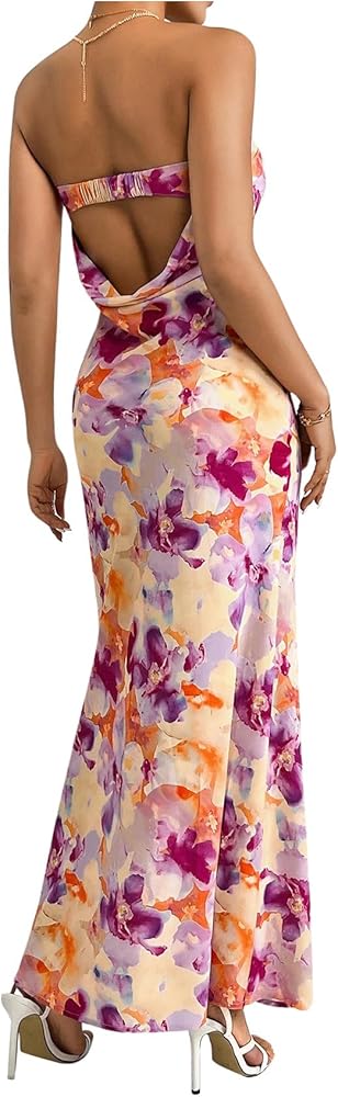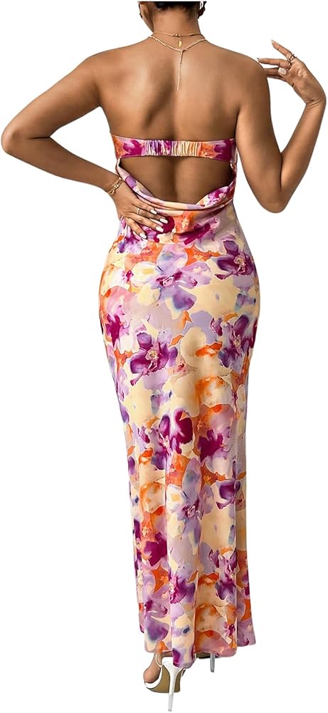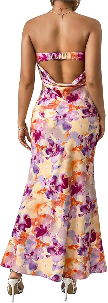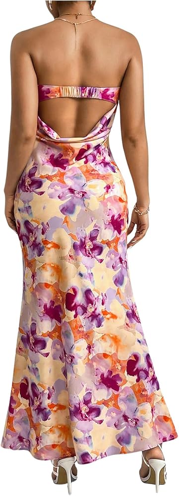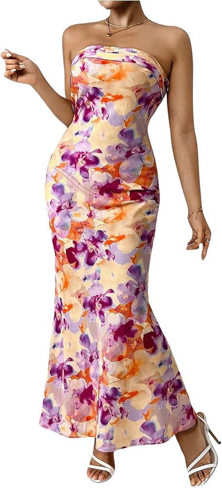 - Design: Floral print, all over print, sleeveless, strapless, draped back, bodycon maxi dress