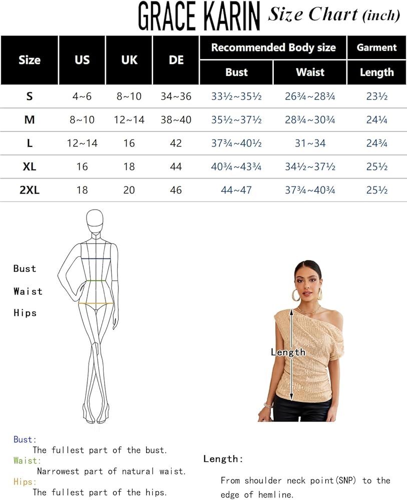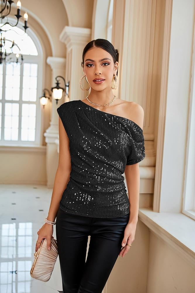 【Features】Trendy One Shoulder Design, Elegant Asymmetrical Neck, Fashion One Short Sleeve Design, Slim Fit Shape, Rouched Design, Sparkling Bling Sequins, Light Stretchy, Off Shoulder Party Tops, Fully Lined, Comfortable and Breathable Material, Pull on closure.