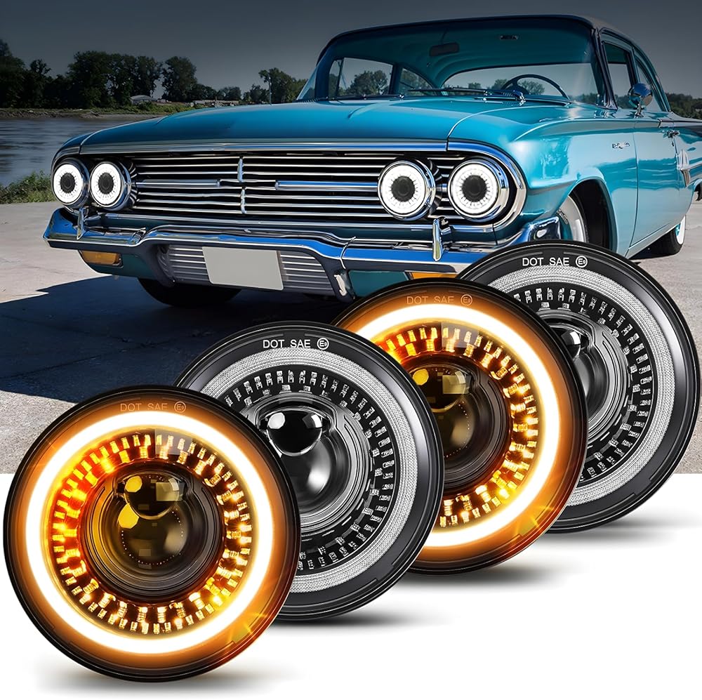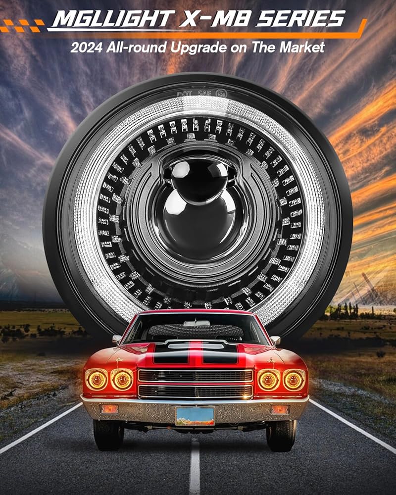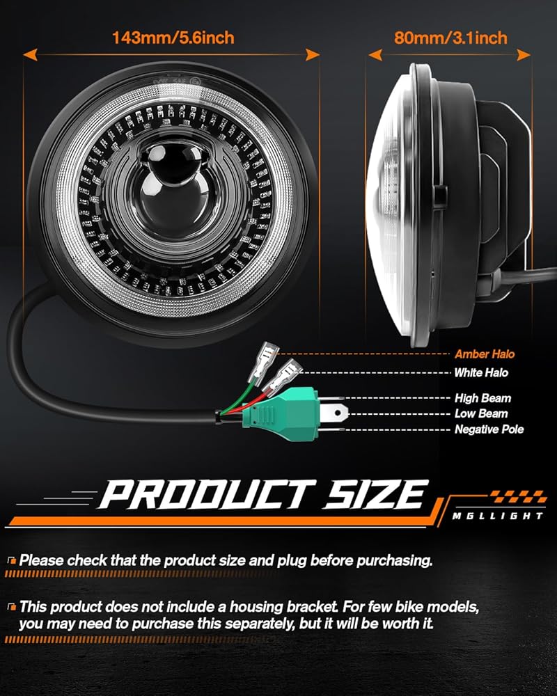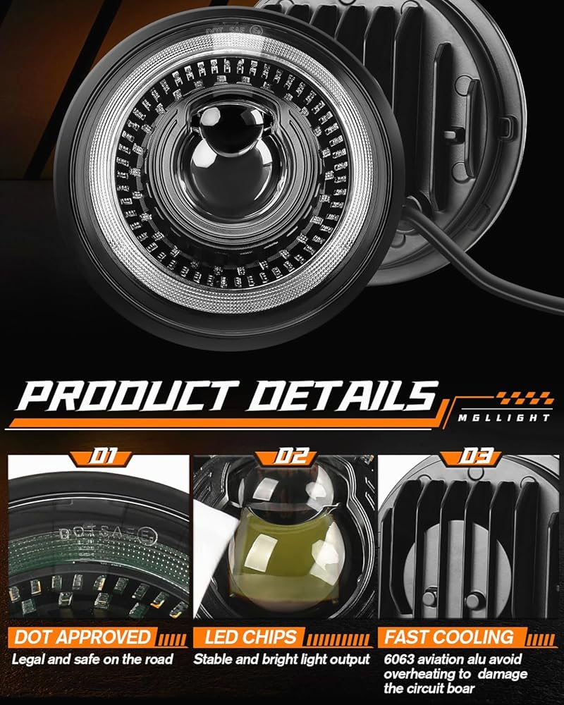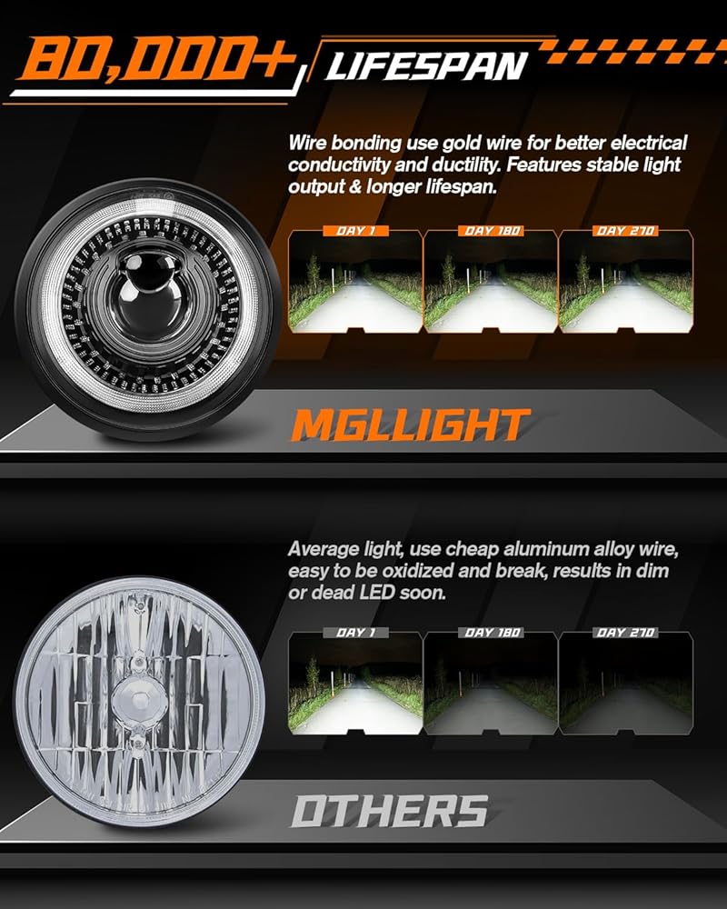 4 LIGHTING MODES: Compared with HID headlight, MGLLIGHT 4pcs 5.75 inch led headlights conversion kit contains everything you need to upgrade your original headlights to the newest LED headlight technology while with classic and cool look! 6000K pure white high beam/low beam/DRL and amber turn signals angel eyes halo ring. This 5-3/4 inch led headlight will meet your different needs for bright and safe driving on road, will be the perfect replacement for your stock halogen or HID headlight.