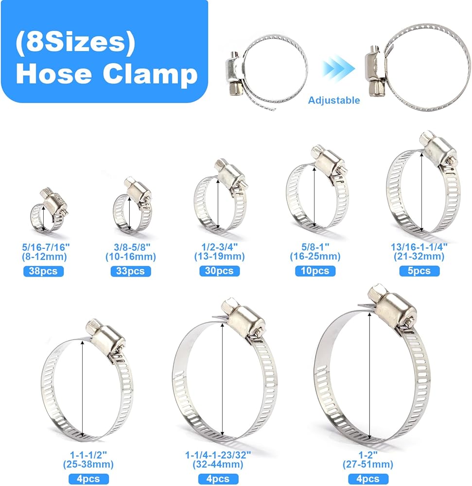 129PCS HOSE CLAMPS STAINLESS STEEL:Metal hose clamps are made of high quality 304 stainless steel material,clamp is sturdy and reliable, then it can be reused,With the superior corrosion resistance performance, our hose clamp set can be used in indoor and outdoor places.