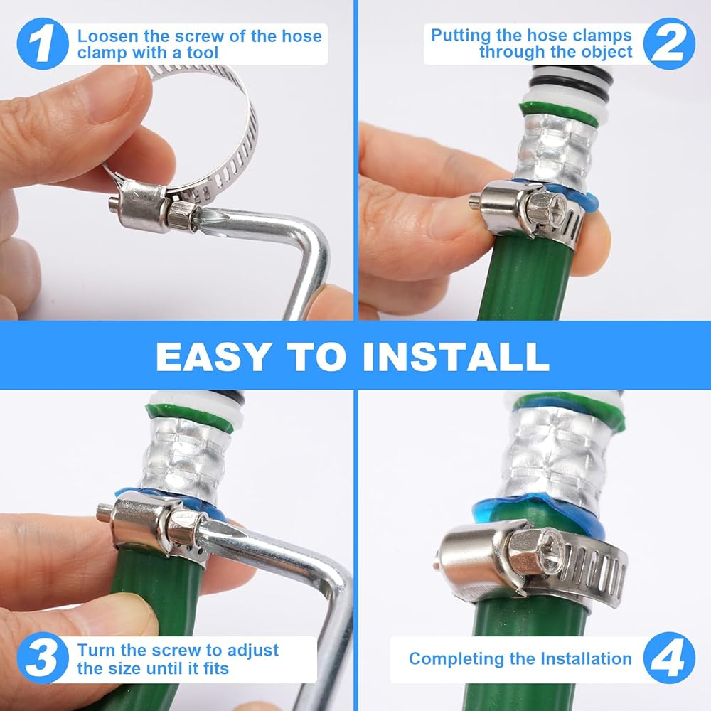 EASY TO INSTALL:Select the right hose clamp and resize, then thread the pipe through the pipe clamp and adjust the size to fitting your hose's size, Just need to use a socket wrench or screwdriver tighten the screw.
