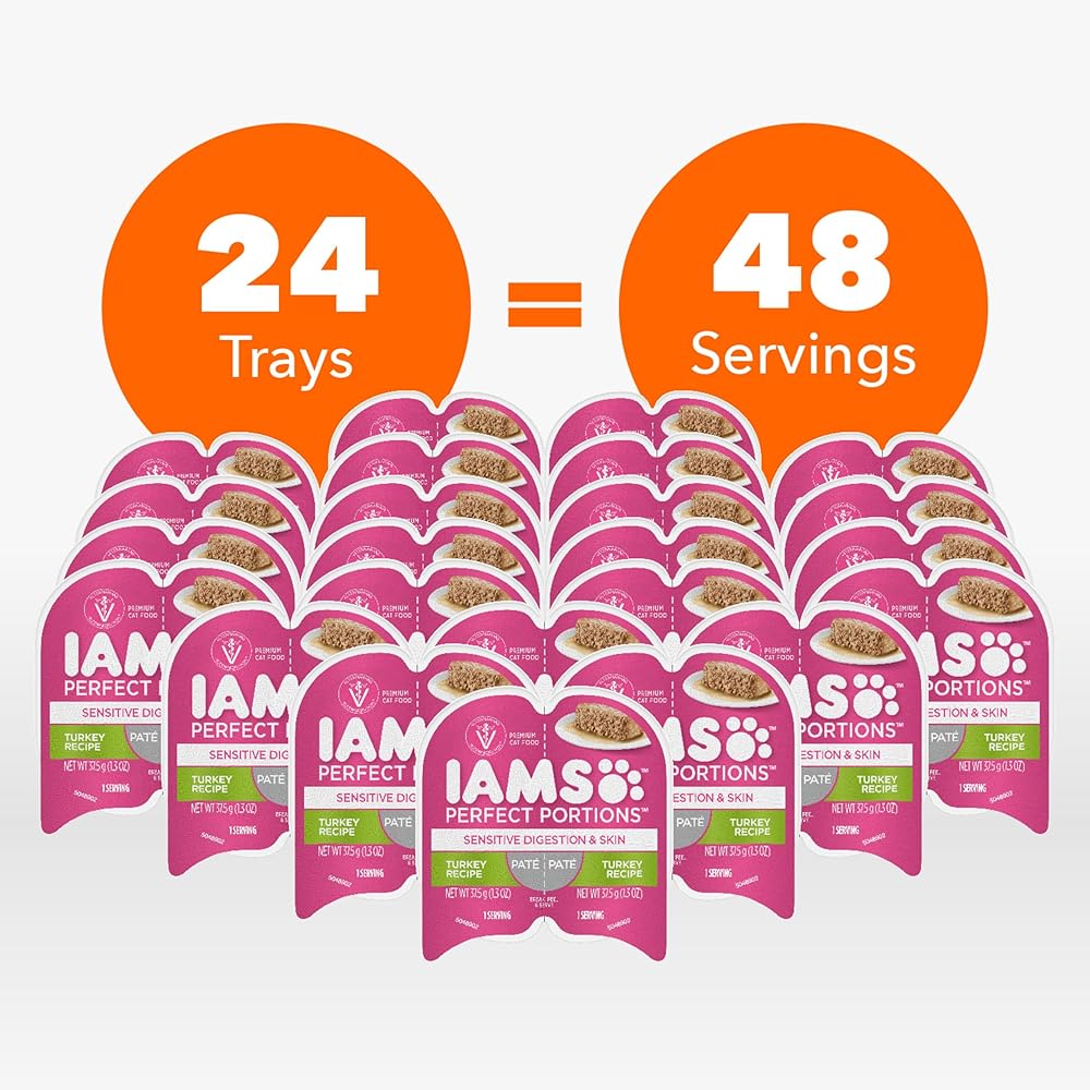 Serve your cat a fresh meal every time. IAMS PERFECT PORTIONS Sensitive Digestion & Skin Turkey Recipe are premium meals that are 100% complete and balanced while being easy on the digestion and nourishing the skin and coat. Our unique fiber blend with prebiotics and beet pulp supports digestive health, and Omega 6 and 3 Fatty Acids promote a healthy skin and glossy coat. These grain-free*, tasty recipes are made with real turkey to help your adult cat maintain strong muscles. Our cat food is made in the USA with the finest ingredients from around the world. Each IAMS PERFECT PORTIONS twin pack contains two individual meals for your adult cat, so they get a fresh meal every time, and there are no messy leftovers. Help keep your cat healthy, happy, and playful for life with tailored nutrition from the IAMS brand. *Trace amounts may be present due to potential cross-contact during manufacturing.