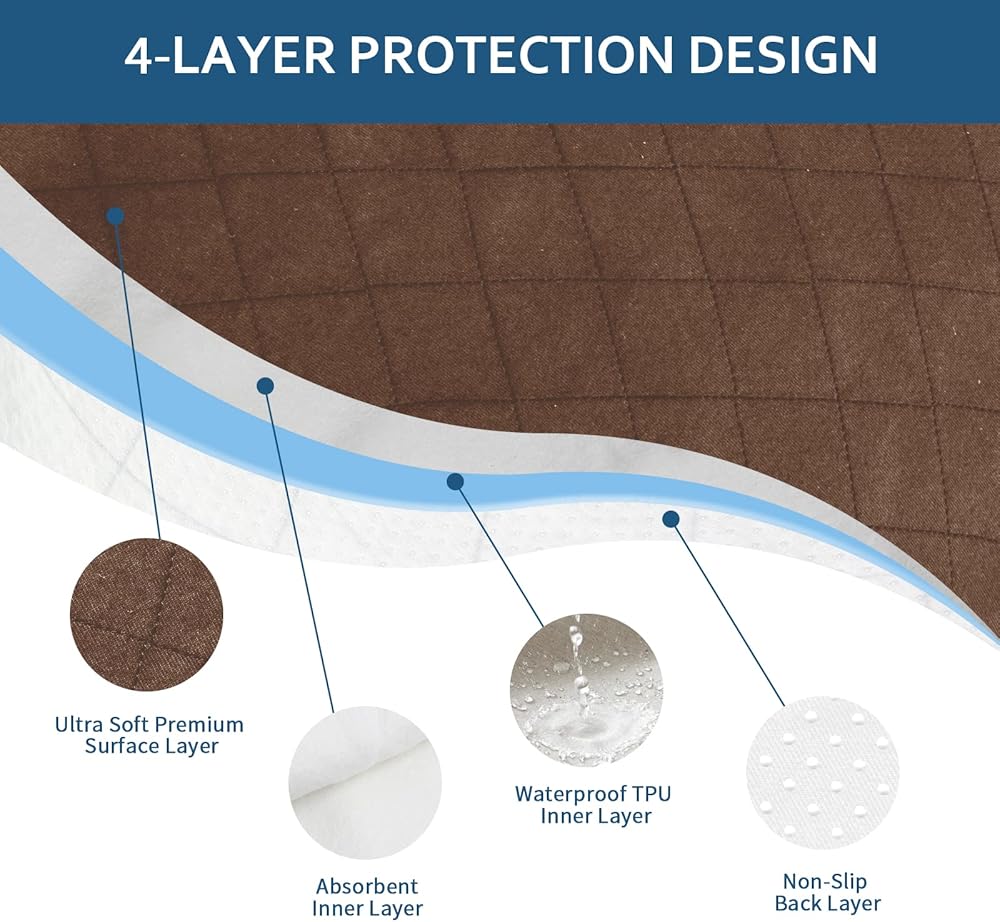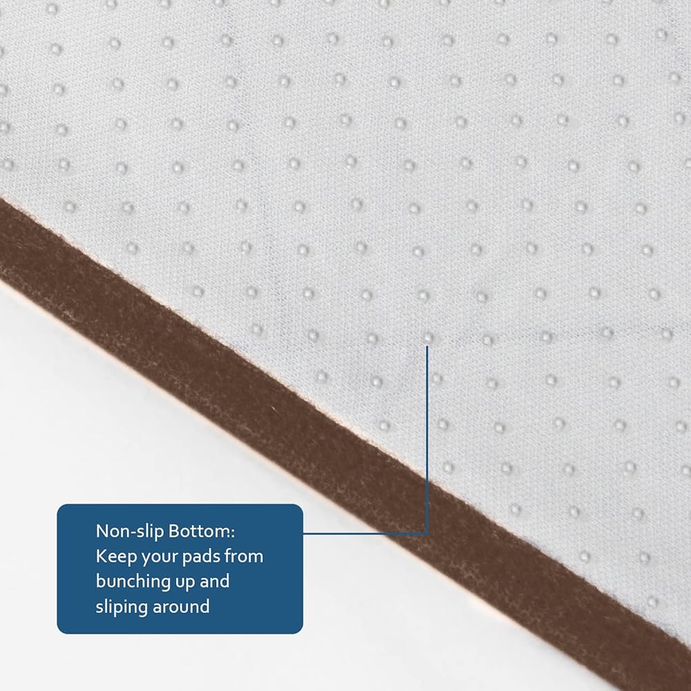 Four Layers Ultra Protection: Quilted top layer use premium brushed polyester knit fabric for softness and comfort, the second layer is made of high density polyester fill for quick absorption and additional comfort. Then the waterproof layer blocks liquids from sinking down. The Bottom Layer use non slip back design ensure the pad stay in place.