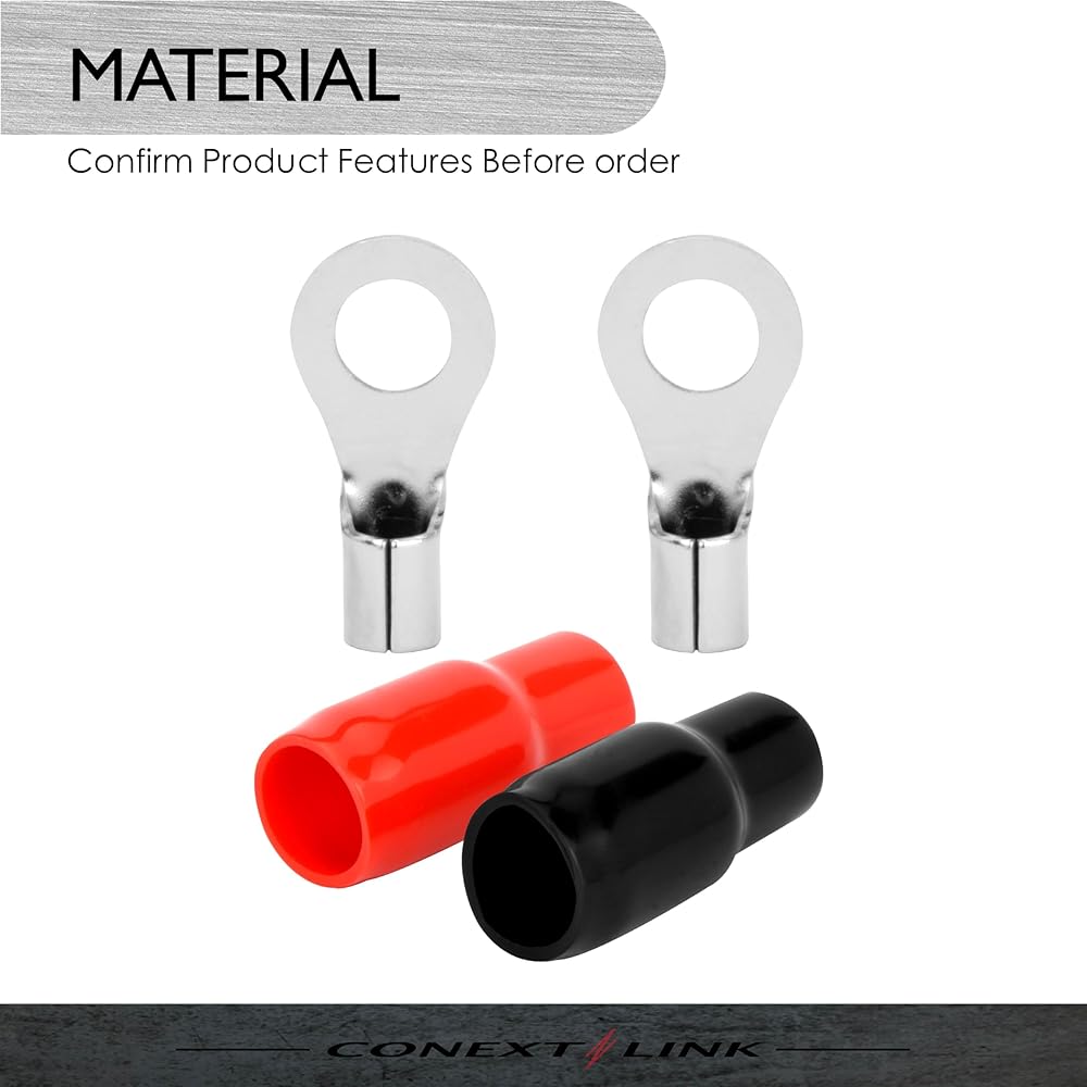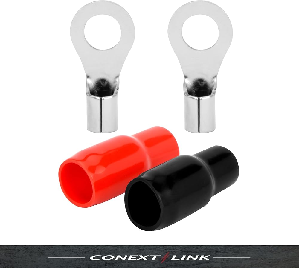 Conext Link RTB88-20 Copper Ring Terminals Insulated Wire Crimp Connectors for Car Audio with Red Black Boot 5/16" 8mm Stud hole 20 Pack (8 Gauge) (16523)