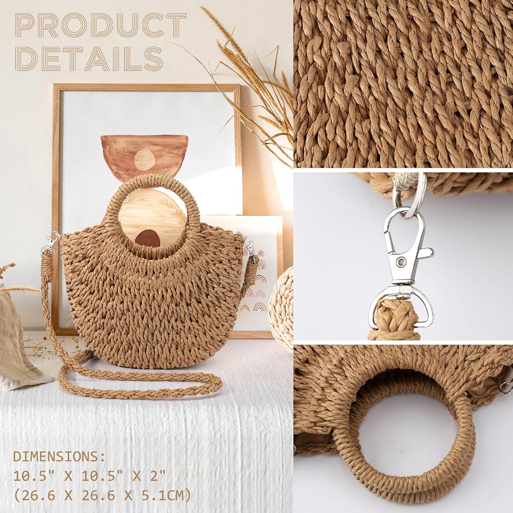 【Exquisite Handmade Straw Purse】Our straw purses and handbags is handmade and measures about 10.5 inches high x 2 inches wide x 10.5 inches high; the beach purse also with an adjustable and removable shoulder strap drops, you can use this straw beach bag as a crossbody bag, shoulder handbag or clutch purses